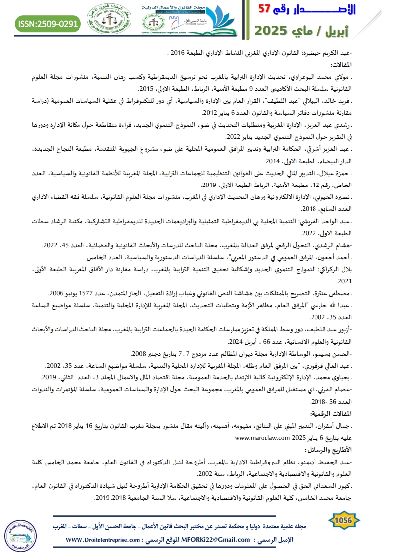 -أزبور عبد اللطيف، دور وسط المملكة في تعزيز ممارسات الحكامة الجيدة بالجماعات الترابية بالمغرب، مجلة الباحث الدراسات والأبحاث القانونية والعلوم الانسانية، عدد 66 ، أبريل 2024.