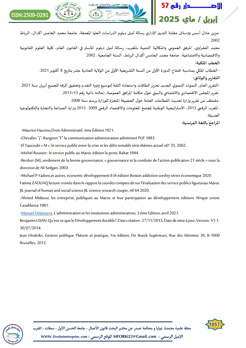 ـ عبدا لله حارسي “المرفق العام، مظاهر الأزمة ومتطلبات التحديث، المجلة المغربية للإدارة المحلية والتنمية، سلسلة مواضيع الساعة العدد 35، 2002.