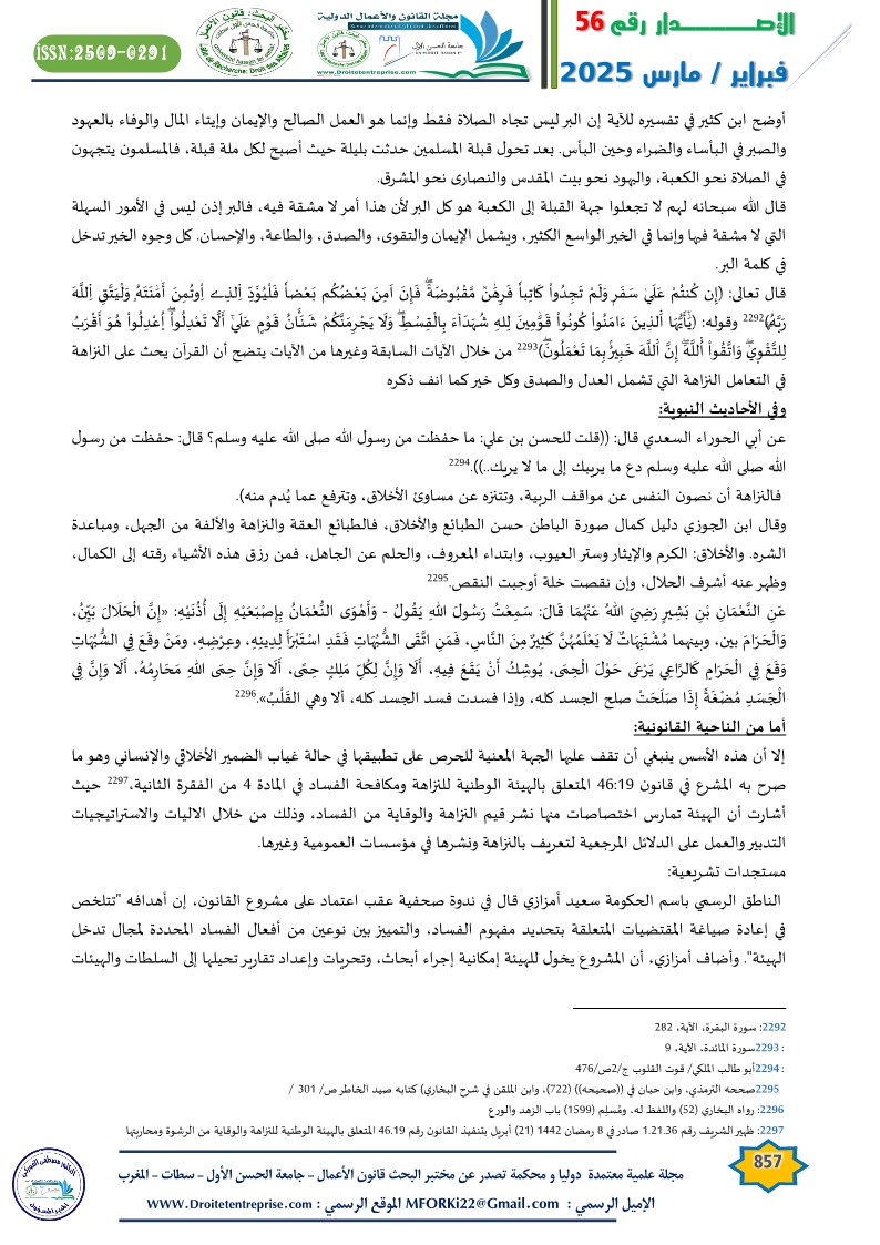تعتبر قيم النزاهة من الركائز الأساسية التي تقوم عليها المجتمعات السليمة، حيث تساهم في بناء الثقة بين الأفراد والمؤسسات في ظل التحديات المعاصرة، وتبرز إشكالية الفساد كظاهرة سلبية تؤثر على التنمية والاستقرار. لذا فإن مكافحة الفساد تتطلب جهدا مضاعفا بين الدول والمنظمات الإقليمية والدولية، ويرجع ذلك بطبيعة الحال إلى ما للفساد من شبكات واتصالات محلية وإقليمية دولية، وبالتالي فإن هذه الدراسة تسعى إلى بيان مظاهر الفساد واستراتيجية مكافحته، من خلال تعاون السلطات العامة داخل البلد الواحد وتعاونها مع المواطنين ومنظمات المجتمع المدني. لهذا فإن دراسة هذا الموضوع من منظور الشريعة والقانون تعتبر مهمة. كما أن لهذا الموضوع أهمية بالغة حيث يساهم في تعزيز العدالة والمساواة في التعاملات الإدارية، وتقليل الفساد الإداري وتحسين الاستخدام الأمثل للموارد، كما يهدف إلى تقليل الفساد الإداري وتحسين الاستخدام الأمثل للموارد. وتحسين جودة الخدمات المقدمة للمواطنين. وعليه فإن إشكالية يمكن صياغتها كالتالي: كيف يمكن تطبيق النزاهة في المؤسسات العامة والخاصة؟ ما هي النظريات والأساليب الفعالة لمكافحة الفساد الإداري؟