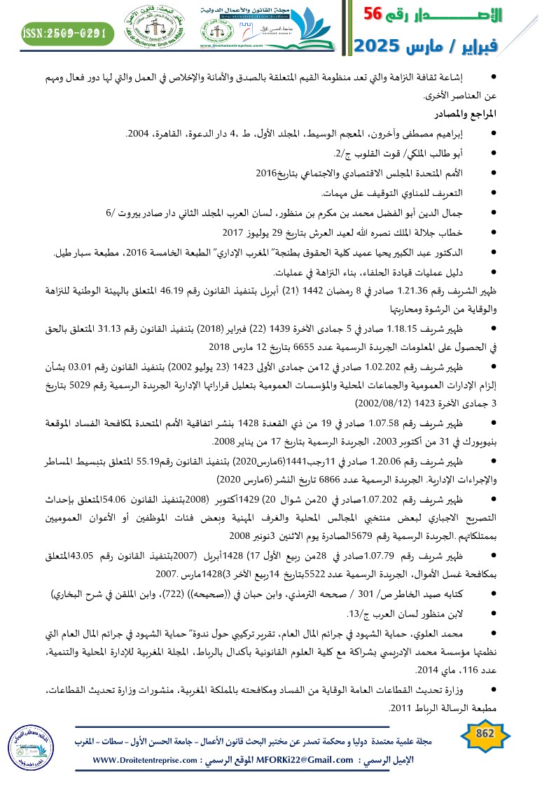 • وزارة تحديث القطاعات العامة الوقاية من الفساد ومكافحته بالمملكة المغربية، منشورات وزارة تحديث القطاعات، مطبعة الرسالة الرباط 2011.