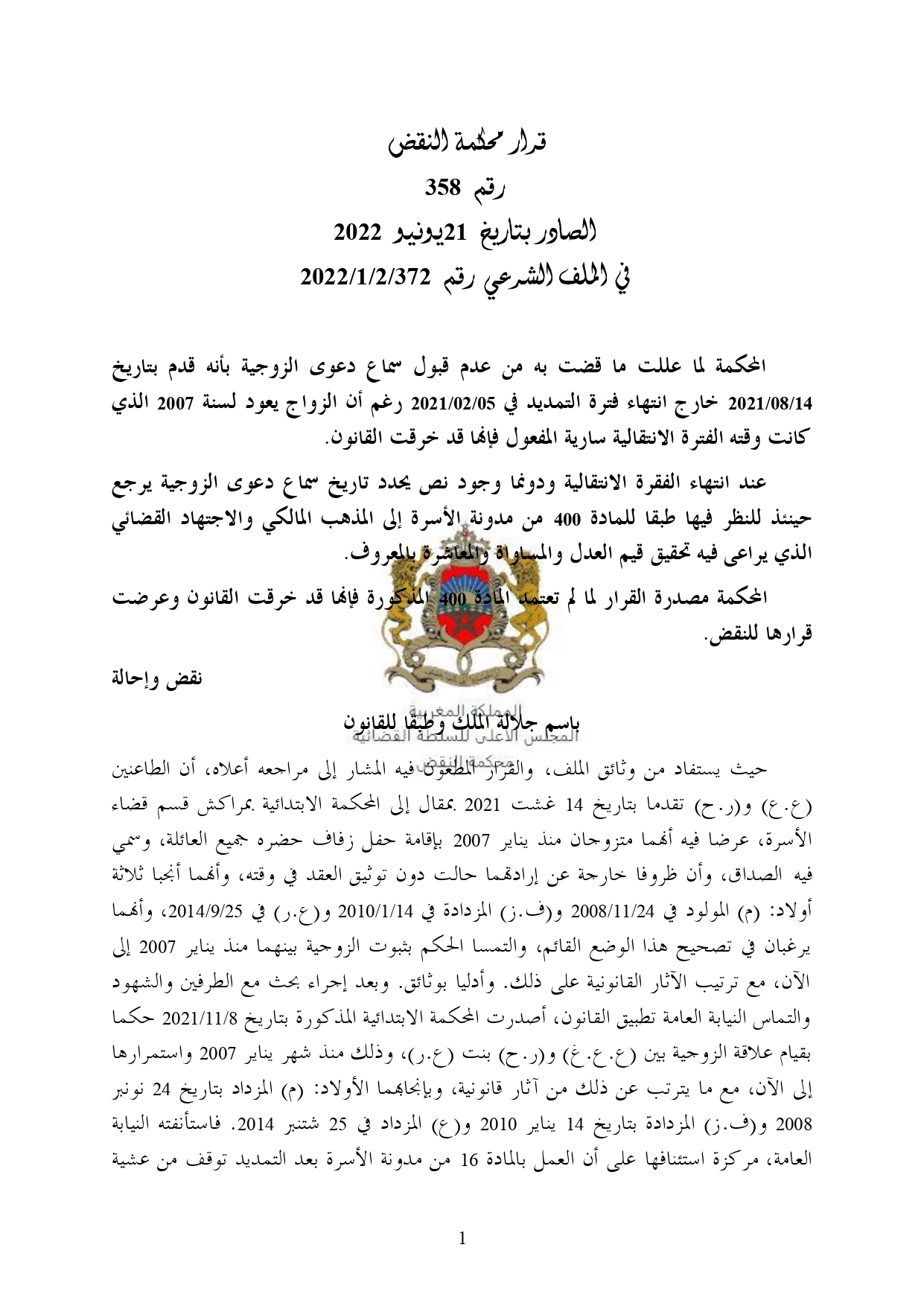 هذا العمل هو عبارة عن تعليق على قرار صادر عن محكمة النقض المغربية رقم 358 صادر بتاريخ 21 يونيو 2022 في الملف الشرعي رقم 372/2/1/2022
