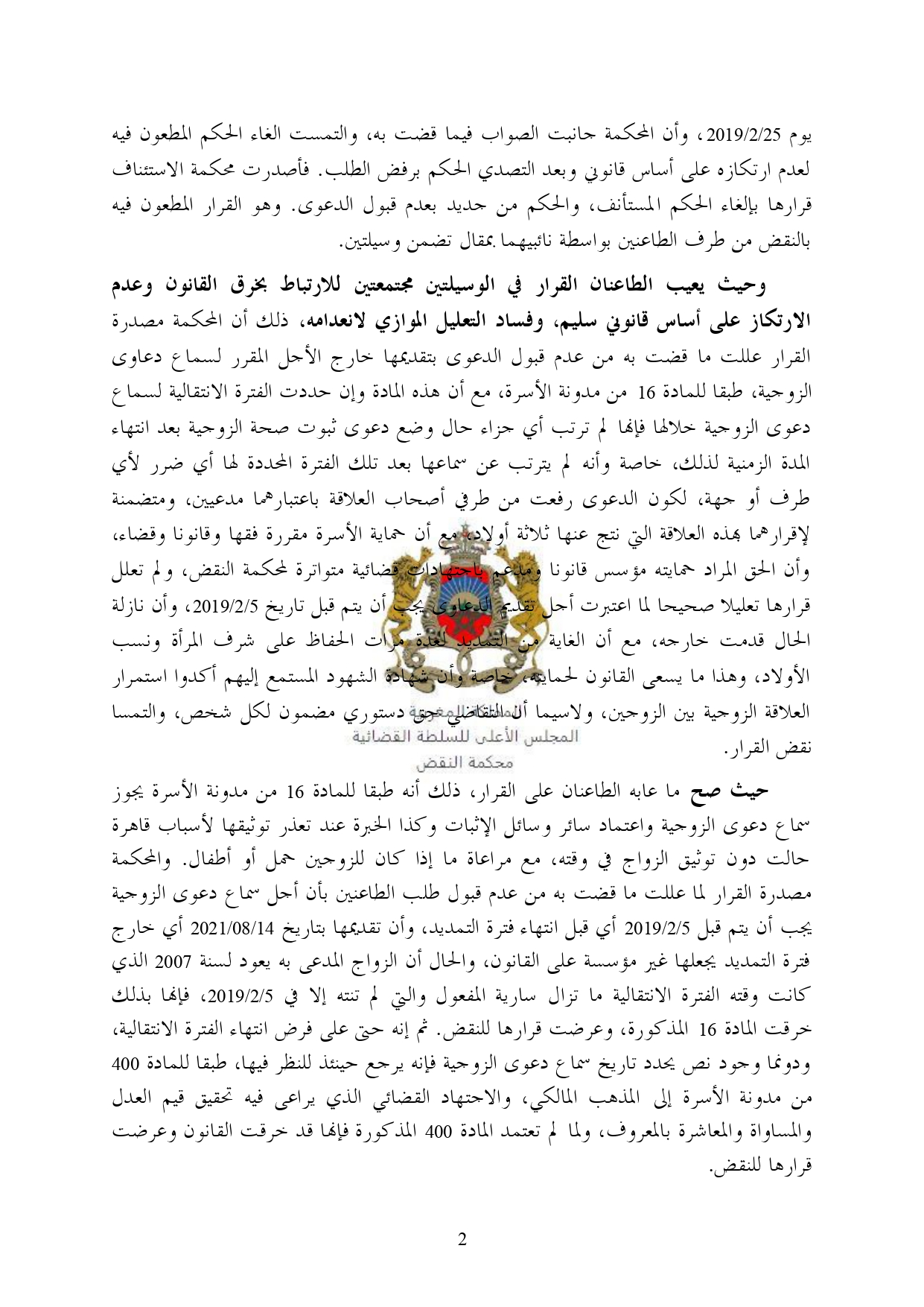 إلا أن محكمة الاستئناف لم تنتبه إلى نقطة مهمة في الدعوى حسب محكمة النقض، وهي أن الزواج موضوع الدعوى قد انعقد في سنة 2007 الذي كانت آنذاك الفترة الانتقالية ما تزال سارية المفعول، ولم تنته إلا بتاريخ 2019/2/5 بحيث أوردت ” …والحال أن الزواج المدعى به يعود لسنة 2007 الذي كانت وقته الفترة الانتقالية ما تزال سارية المفعول، والتي لم تنته إلا في تاريخ 2019/2/5، فإنها بذلك خرقت المادة 16 المذكورة، وعرضت قرارها النقض”.