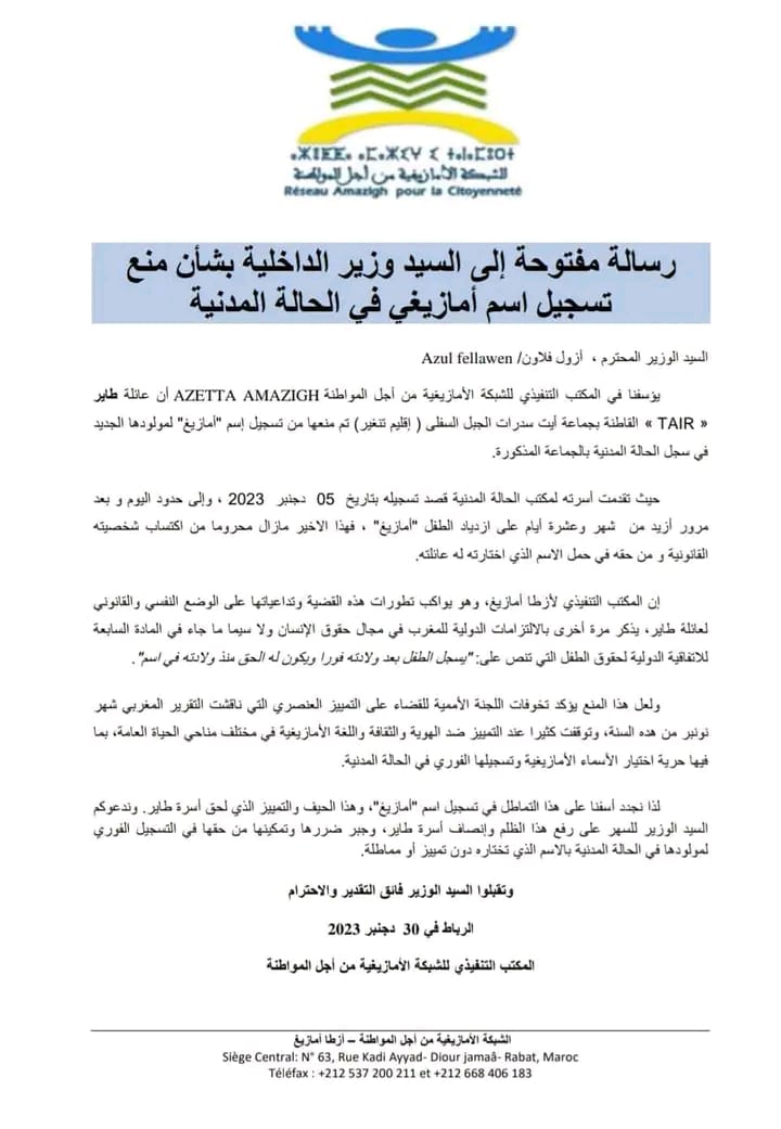 وكذلك رسالة الشبكة الأمازيغية من أجل المواطنة إلى السيد وزير الداخلية ووزير العدل والتي تنص على أنه : ” للمرة الرابعة في ظرف شهرين الدولة تستمر في قمع حق الأمازيغ في الشخصية القانونية على بعد عشرين يوما على مناقشة اللجنة الفرعية لمناهضة كافة أشكال التمييز العنصري للتقرير الدوري الحكومي المغربي، وبعد المنع الذي طال أسماء سيفاو بمكنان وسيمان ببوفكران وتيتريت تودة بمدينة كروتاي Créteil بفرنسا، تلقى المكتب التنفيذي للشبكة الأمازيغية من أجل المواطنة مجددا للمرة الرابعة في ظرف شهرين باستياء شديد تقريرا يخص إقدام سلطات الجماعة الحضرية، الملحقة الإدارية أيت أورير بمراكش بتاريخ 02/03/2009 على منع السيد رشيد المبروكي ورفض تسمية ابنته المزدادة بتاريخ 09/03/2009 اسما أمازيغيا” ڭايا( ” (GAIA، بعلة إرسالية وزير الداخلية بتاريخ 24/6/2005 تحت رقم 160… نعلن عزمنا على رفع تقرير كامل ومضاد للجنة الفرعية المعنية بمناهضة التمييز العرقي المزمع عقده يوم 20 أبريل 2009 بجنيف، بالإضافة إلى توجيه نداء عاجل للمفوضية السامية لحقوق الإنسان للتعاطي بجدية مع التزامات الحكومة المغربية والتي يتم