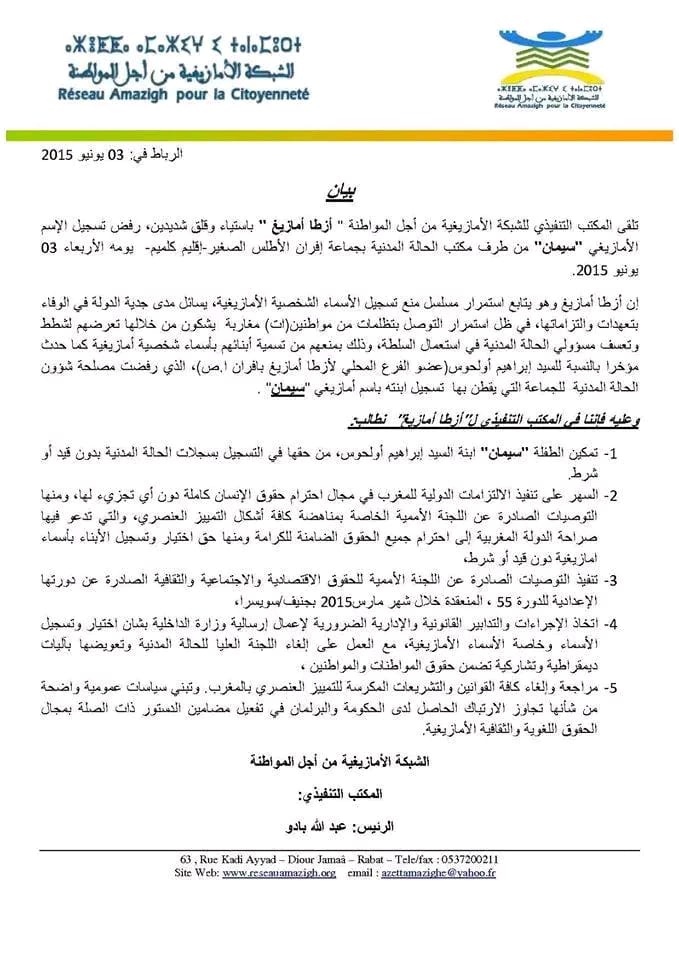 - ” أنه منذ سنة 2003 تدخل الملك محمد السادس شخصيا لإقرار الأسماء الأمازيغية وتسجيل الأسماء الممنوعة، كما ّتم بصدور القانون الجديد للحالة المدنية إلغاء لائحة ادريس البصري وعبد الوهاب بن منصور التي كانت أصل المشكل، إذ كانت تفرض على جميع المغاربة أسماء عربية حصريا.