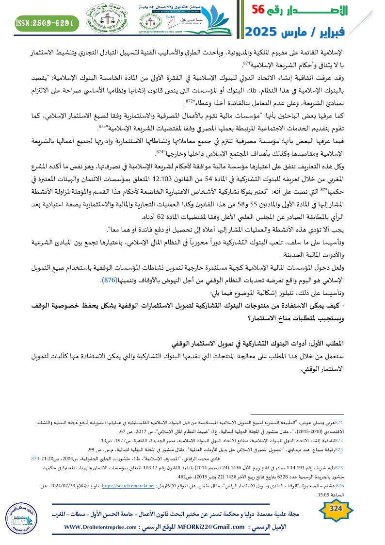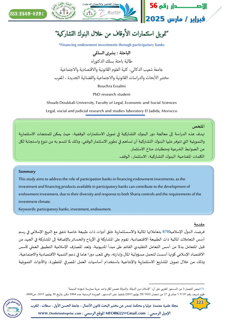 الكلمات المفتاحية: البنوك التشاركية، الاستثمار، الوقف.