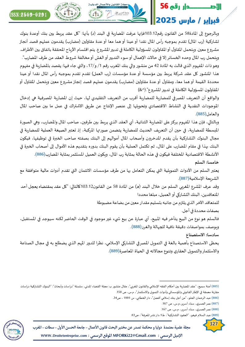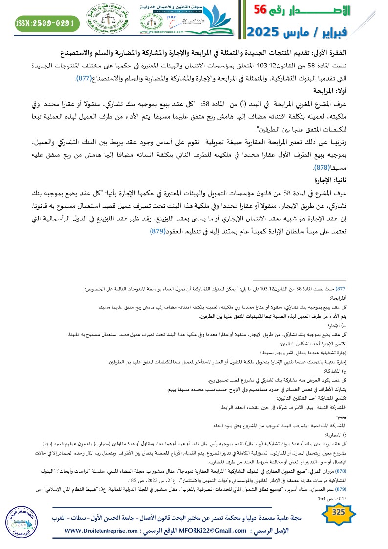 نصت المادة 58 من القانون103.12 المتعلق بمؤسسات الائتمان والهيئات المعتبرة في حكمها على مختلف المنتوجات الجديدة التي تقدمها البنوك التشاركية، والمتمثلة في المرابحة والإجارة والمشاركة والمضاربة والسلم والاستصناع( ).