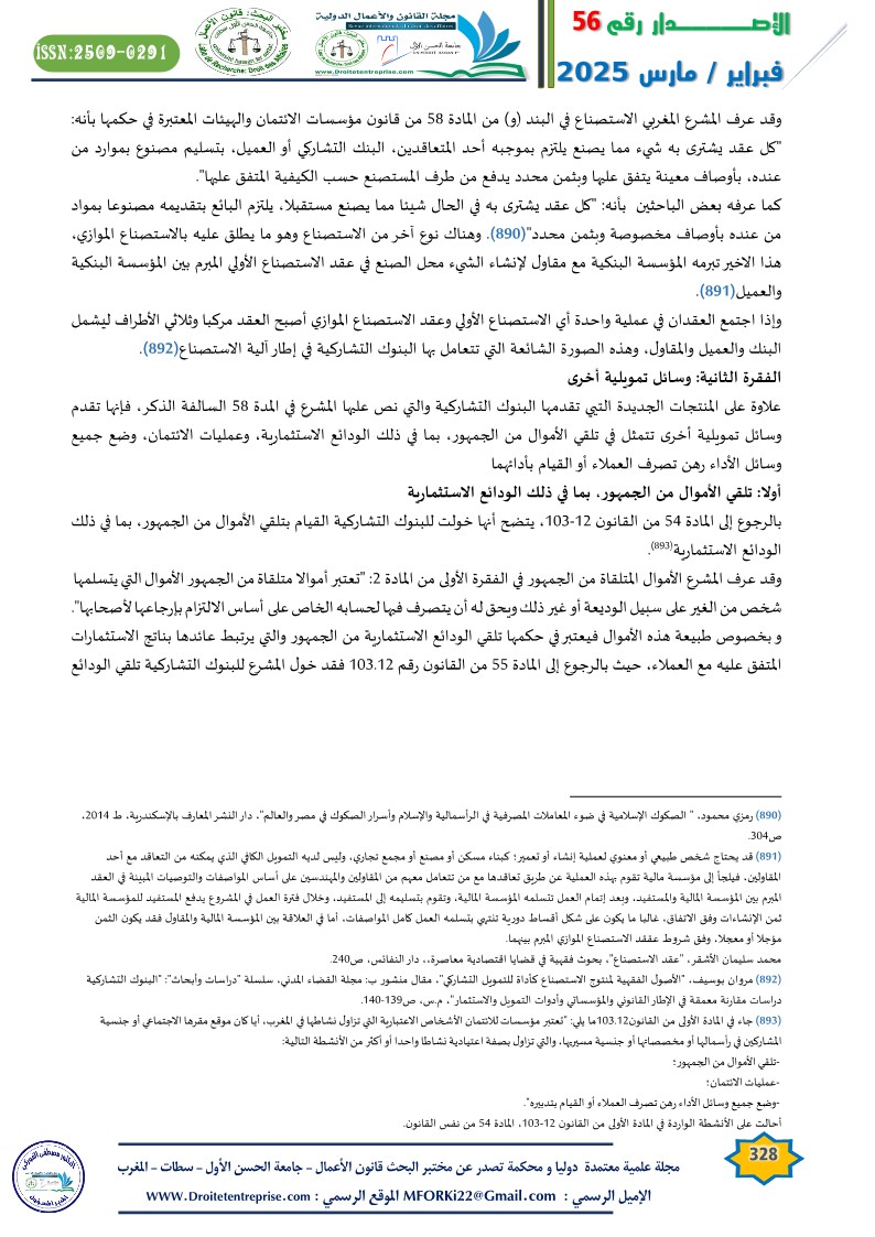 مروان بوسيف، “الأصول الفقهية لمنتوج الاستصناع كأداة للتمويل التشاركي”، مقال منشور ب: مجلة القضاء المدني، سلسلة “دراسات وأبحاث”: “البنوك التشاركية دراسات مقارنة معمقة في الإطار القانوني والمؤسساتي وأدوات التمويل والاستثمار”.