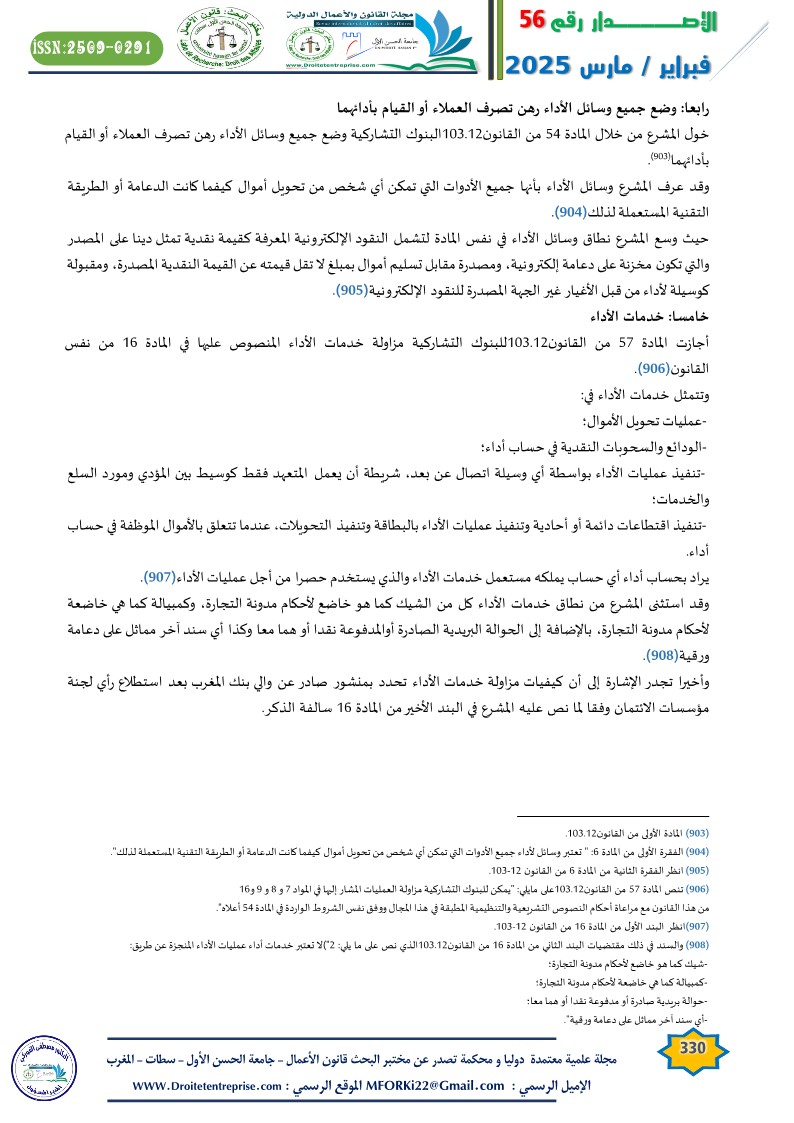 خول المشرع من خلال المادة 54 من القانون103.12البنوك التشاركية وضع جميع وسائل الأداء رهن تصرف العملاء أو القيام بأدائهما( ).