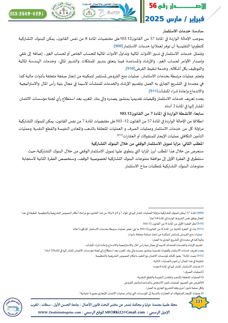 بموجب الإحالة الواردة في المادة 57 من القانون103.12على مقتضيات المادة 8 من نفس القانون، يمكن للبنوك التشاركية كنظيرتها التقليدية أن توفر لعملائها خدمات الاستثمار( ).
