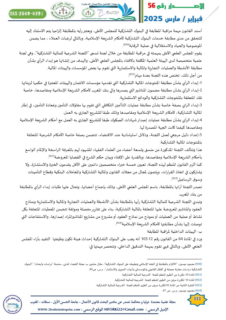 وحتى يتم الاطمئنان إلى شرعية المعاملات التي ستقدم عليها البنوك التشاركية أحدث المشرع “هيئات المطابقة الشرعية”، رغم أنه في التجارب المقارنة تستعمل في الغالب تعبير “الرقابة الشرعية”، وتتم المطابقة الشرعية على مستويين اثنين مستوى أول تقوم به هيئة مستقلة عن الأبناك تسمى “اللجنة الشرعية للمالية التشاركية”( ) تعمل تحت إشراف المجلس العلمي الأعلى”( )، أما المستوى الثاني من المطابقة الشرعية فتقوم به هيئة داخلية للتدقيق تسمى “وظيفة التقيد بآراء المجلس العلمي الأعلى”، وهي ذات طبيعة تنفيذية تسهر على التنفيذ اليومي للمطابقة الشرعية، بغرض مطابقة المعاملات التي تقوم بها هذه الأبناك، مع آراء اللجنة الشرعية للمالية التشاركية( ).
