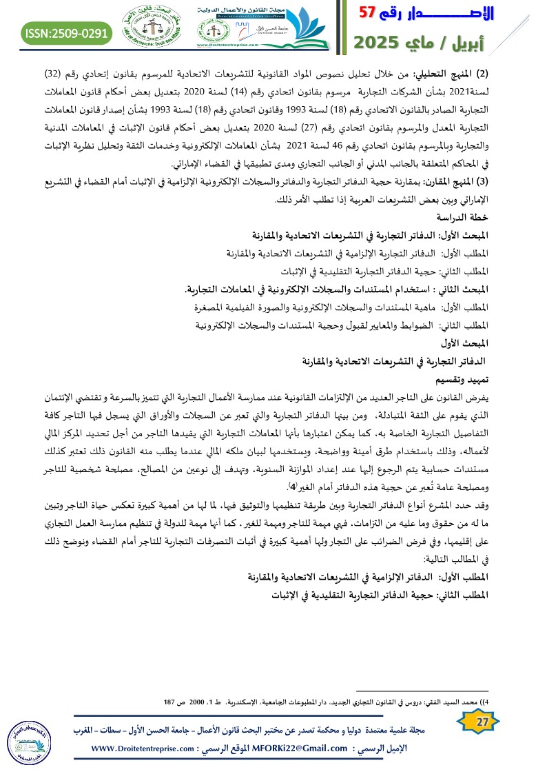 (3) المنهج المقارن: بمقارنة حجية الدفاتر التجارية والدفاتر والسجلات الإلكترونية الإلزامية في الإثبات أمام القضاء في التشريع الإماراتي وبين بعض التشريعات العربية إذا تطلب الأمر ذلك.