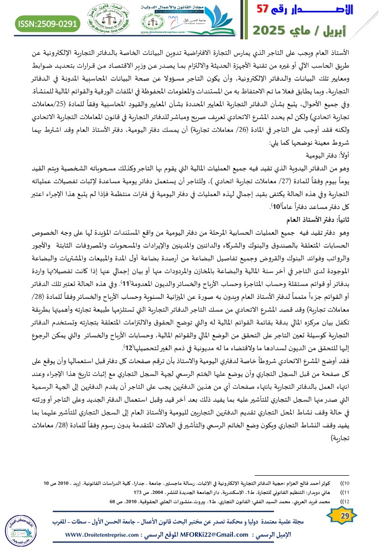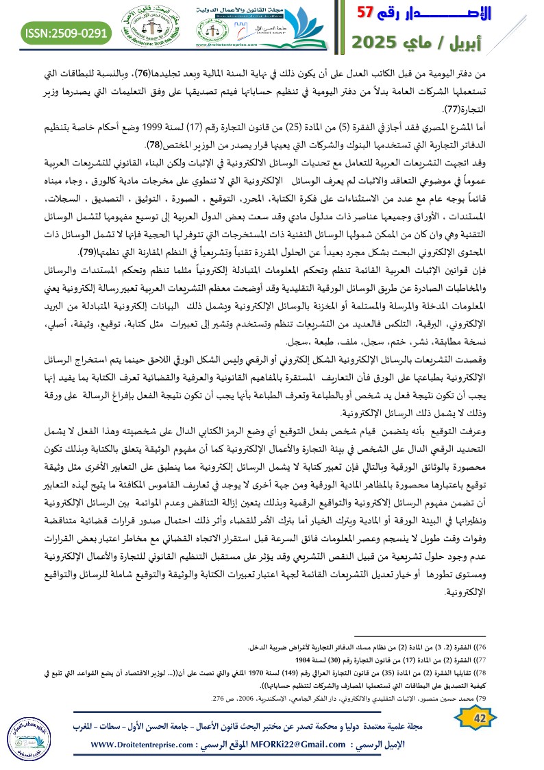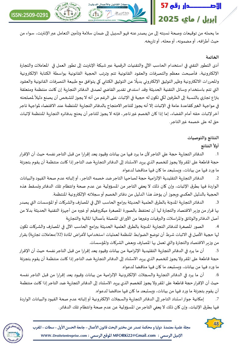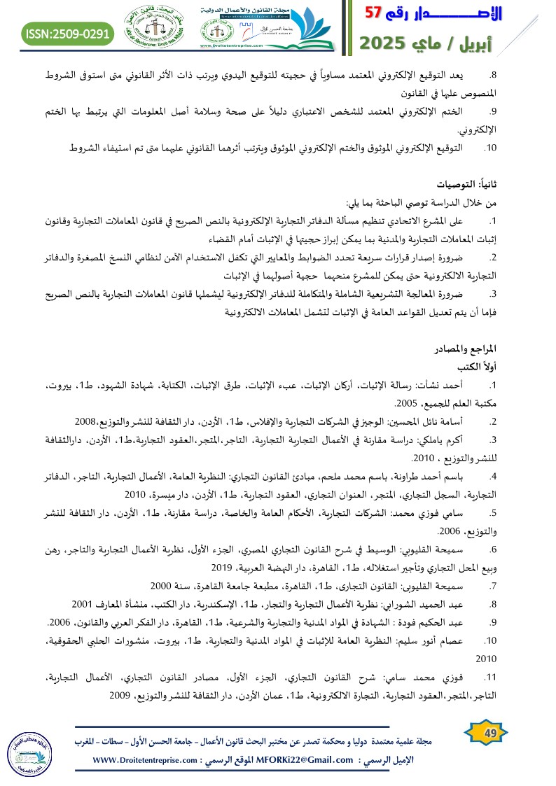 1. أحمد محمود المساعدة: حجية الدفاتر التجارية الإلكترونية في الاثبات، مجلة العلوم القانونية والسياسية، الجزائر، جامعة الوادي، العدد(4) عام 2012،