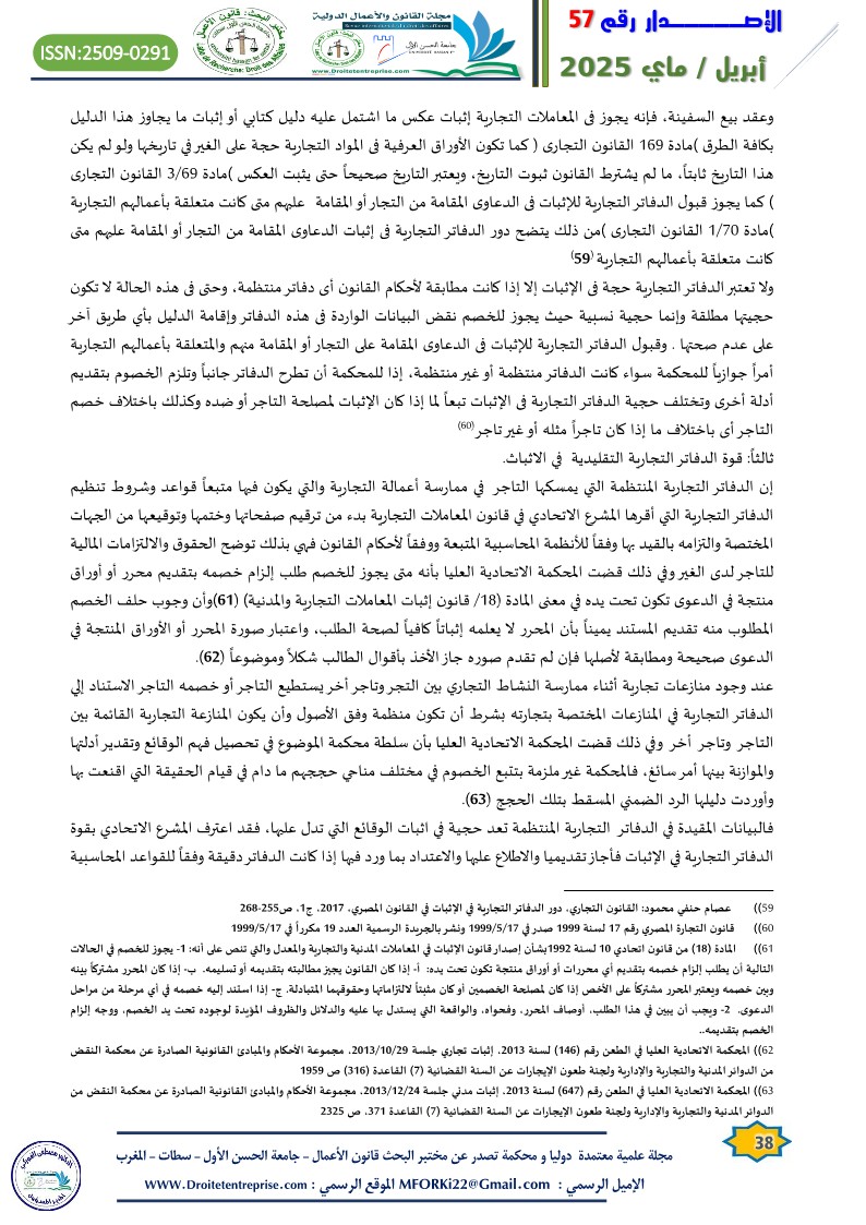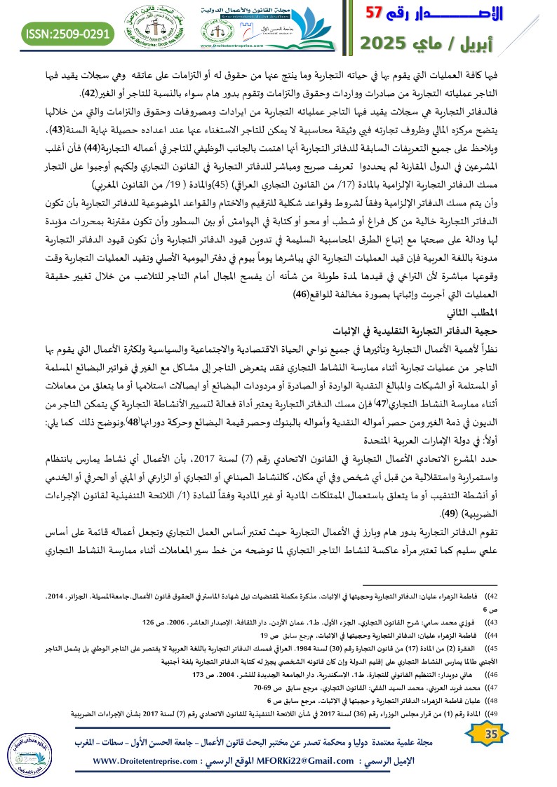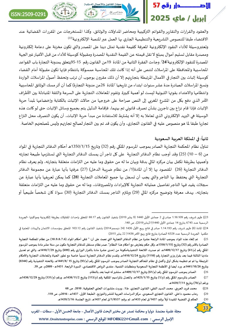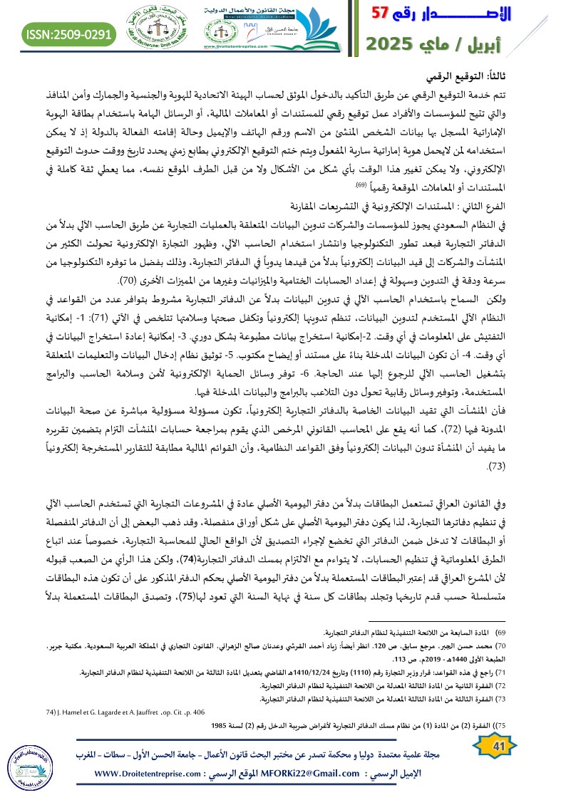 1. أحمد محمود المساعدة: حجية الدفاتر التجارية الإلكترونية في الاثبات، مجلة العلوم القانونية والسياسية، الجزائر، جامعة الوادي، العدد(4) عام 2012،