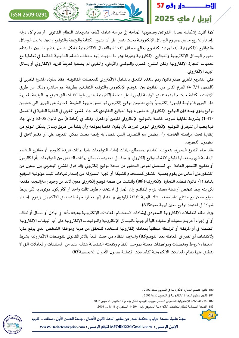 ففي التشريع المغربي صدر قانون رقم 53.05 المتعلق بالتبادل الإلكتروني للمعطيات القانونية فقد ساوى المشرع المغربي في (الفصل 1/417) الفرع الثاني من القانون بين التوقيع الإلكتروني والتوقيع التقليدي بطريقة غير مباشرة وذلك عن طريق الإثبات بالكتابة حيث جاء فيه تتمتع الوثيقة المحررة على دعامة إلكترونية بنفس قوة الإثبات التي تتمتع بها الوثيقة المحررة على الورق فالوثيقة المحررة إلكترونياً والتي تتضمن توقيع إلكتروني لها نفس حجية الوثيقة المحررة على الورق التي تتضمن توقيع يدوي ومنه فإن التوقيع الإلكتروني له نفس حجية التوقيع التقليدي كما جاء المشرع المغربي في الفقرة الثانية في (الفصل 417-1) بشروط تقابلها شروط خاصة بالتوقيع الإلكتروني المؤمن أو المعزز، وذلك في (المادة 6) من قانون 05-53 والتي جاء فيها يجب أن تتوفر في التوقيع الإلكتروني المؤمن شروط بأن يكون خاصا بموقعه وأن ينشأ عن طريق وسائل يتمكن الموقع من إبقائها تحت مراقبته الخاصة وأن يضمن مع التصرف الذي يتصل به رابطة بحيث يمكن التعرف على أي تغيير لاحق في مضمون التصرف.
