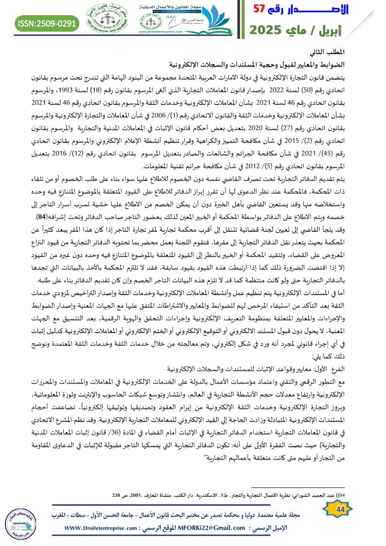 مع التطور الرقمي والتقني واعتماد مؤسسات الأعمال بالدولة على الخدمات الإلكترونية في المعاملات والمستندات والمحررات الإلكترونية وارتفاع معدلات حجم الأنشطة التجارية في العالم، وانتشار وتوسع شبكات الحاسوب والإنترنت وثورة المعلوماتية، وبروز التجارة الإلكترونية وخدمات الثقة الإلكترونية من إبرام العقود وتصديقها وتوثيقها إلكترونياً، تضاعفت أحجام المستندات الإلكترونية المتبادلة وزادت الحاجة إلي القيد الإلكتروني للمعاملات التجارية الإلكترونية. وقد نظم المشرع الاتحادي في قانون المعاملات التجارية استخدام الدفاتر التجارية في الإثبات أمام القضاء في المادة (36/ قانون إثبات المعاملات المدنية والتجارية) حيث نصت الفقرة الأولى على أنه: تكون الدفاتر التجارية التي يمسكها التاجر مقبولة للإثبات في الدعاوى المقاومة من التجار أو عليهم متى كانت متعلقة بأعمالهم التجارية”