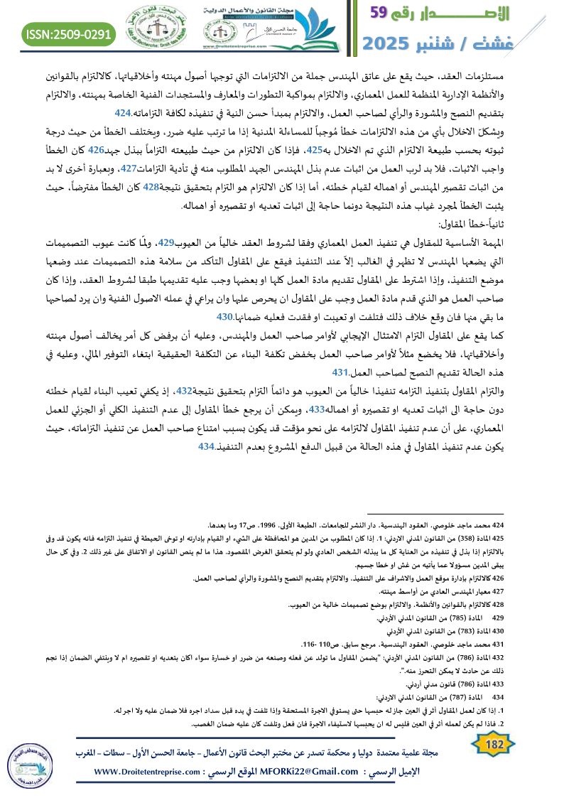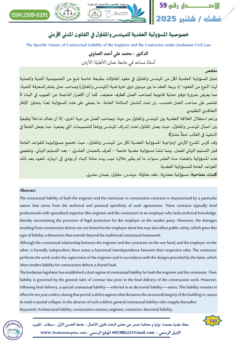 خصوصية المسؤولية العقدية للمهندس والمقاول في القانون المدني الأردني الدكتور : محمد علي أحمد العماوي