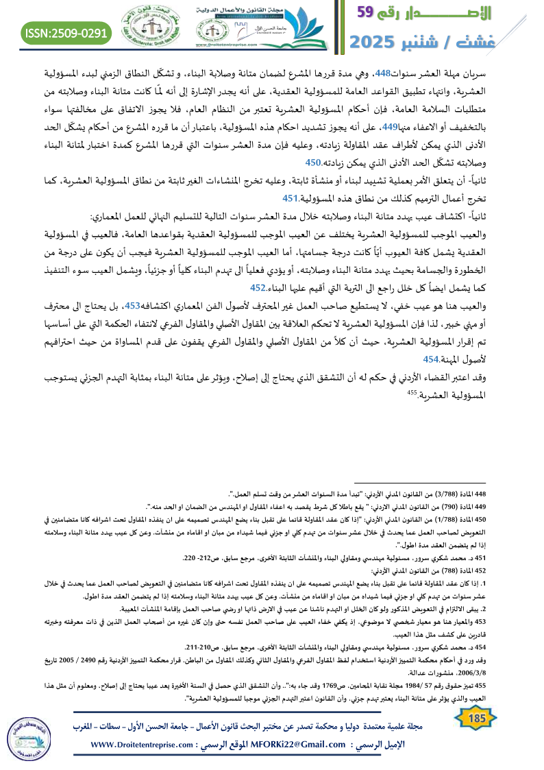The Jordanian legislator has established a dual regime of contractual liability for both the engineer and the contractor. Their liability is governed by the general rules of contract law prior to the final delivery of the construction work. However, following final delivery, a special contractual liability—referred to as decennial liability—arises. This liability remains in effect for ten years unless, during that period, a defect appears that threatens the structural integrity of the building or causes its total or partial collapse. In the absence of such a defect, general contractual liability rules reapply thereafter.