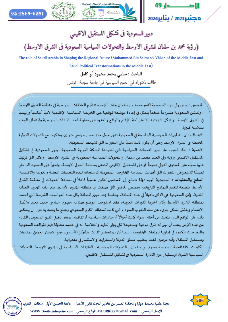 دور السعودية فى تشكيل المستقبل الاقليمي(رؤية محمد بن سلمان للشرق الاوسط والتحولات السياسية السعودية فى الشرق الاوسط) – الباحث : سامي محمد محمود أبو كامل طالب دكتوراه في العلوم السياسية في جامعة سوسة _تونس