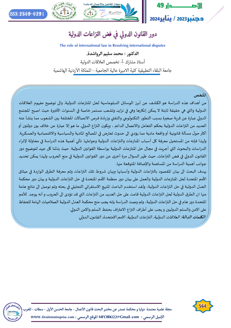 دور القانون الدولي في فض النزاعات الدولية – الدكتور : محمد سليم الرواشدة, أستاذ مشارك -أ- تخصص العلاقات الدولية جامعة البلقاء التطبيقية كلية الاميرة عالية الجامعية – المملكة الأردنية الهاشمية