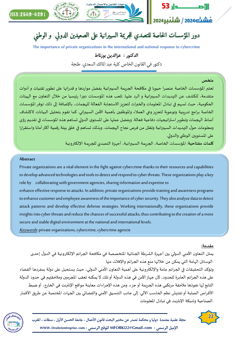 دور المؤسسات الخاصة للتصدي للجريمة السيبرانية على الصعيدين الدولي و الوطني – الدكتور : عزالدين بوزلماط دكتور في القانون الخاص كلية عبد المالك السعدي طنجة