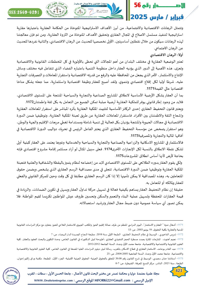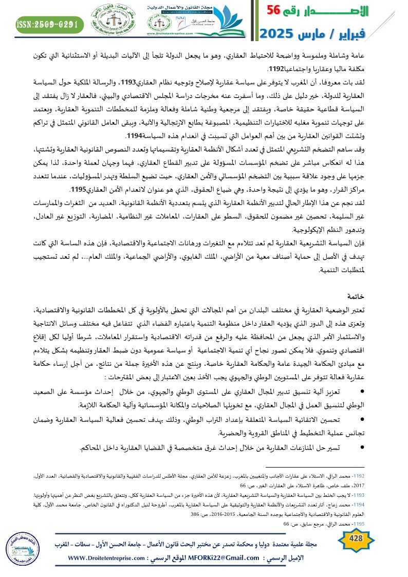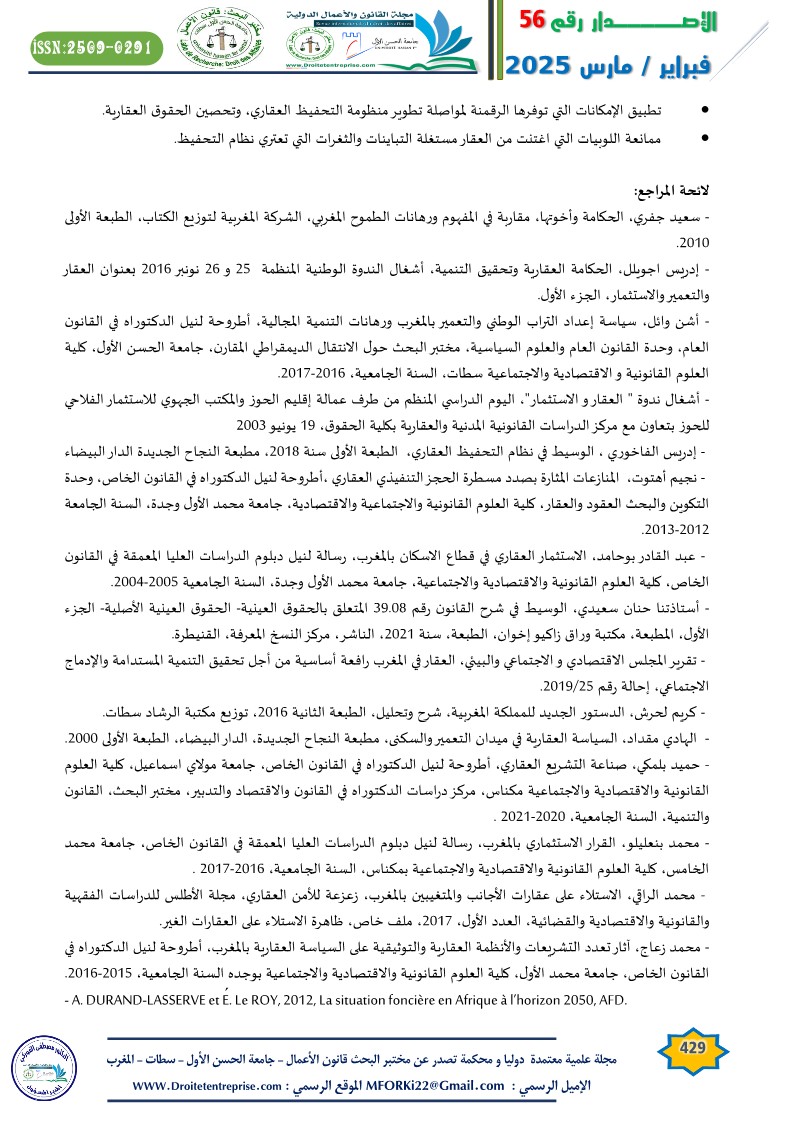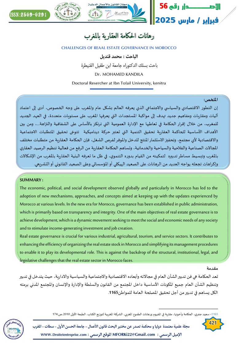 Real estate governance is crucial for various industrial, agricultural, tourism, and service sectors. It contributes to enhancing the efficiency of organizing the real estate stock in Morocco and simplifying its management procedures to enable it to play its developmental role. This is against the backdrop of the structural, institutional, legal, and legislative challenges that the real estate sector in Morocco faces.
