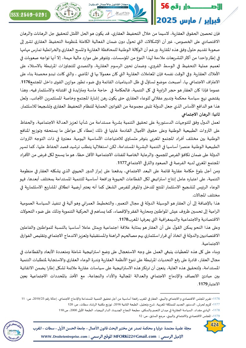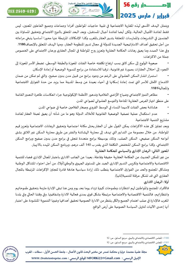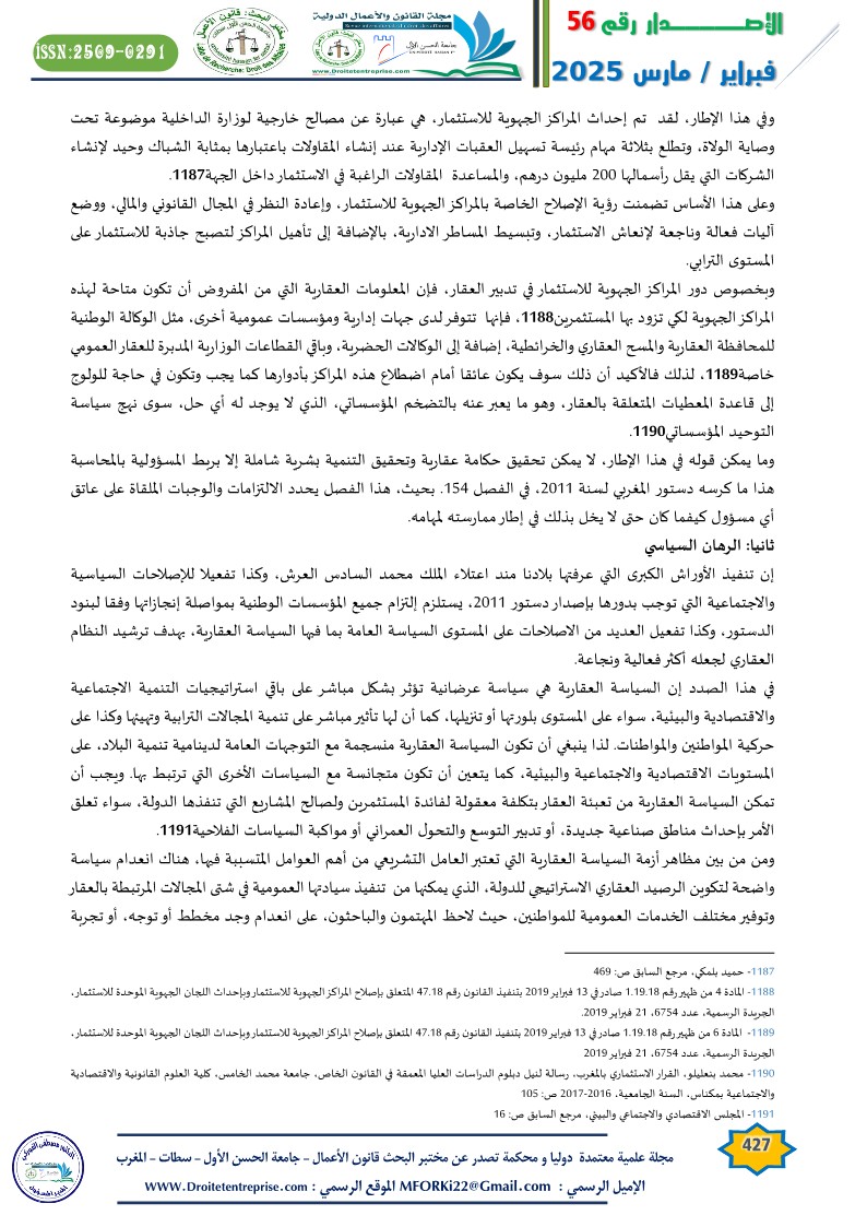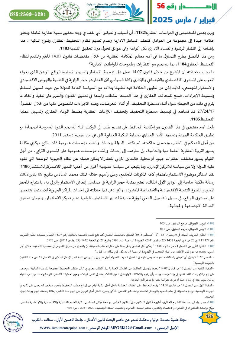 Real estate governance is crucial for various industrial, agricultural, tourism, and service sectors. It contributes to enhancing the efficiency of organizing the real estate stock in Morocco and simplifying its management procedures to enable it to play its developmental role. This is against the backdrop of the structural, institutional, legal, and legislative challenges that the real estate sector in Morocco faces.