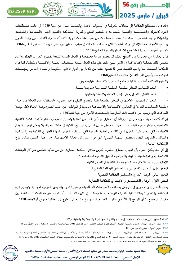 The economic, political, and social development observed globally and particularly in Morocco has led to the adoption of new mechanisms, approaches, and concepts aimed at keeping up with the updates experienced by Morocco at various levels. In the new era for Morocco, governance has been established in public administration, which is primarily based on transparency and integrity. One of the main objectives of real estate governance is to achieve development, which is a dynamic movement seeking to meet the social and economic needs of any society and to stimulate income-generating investment and job creation.