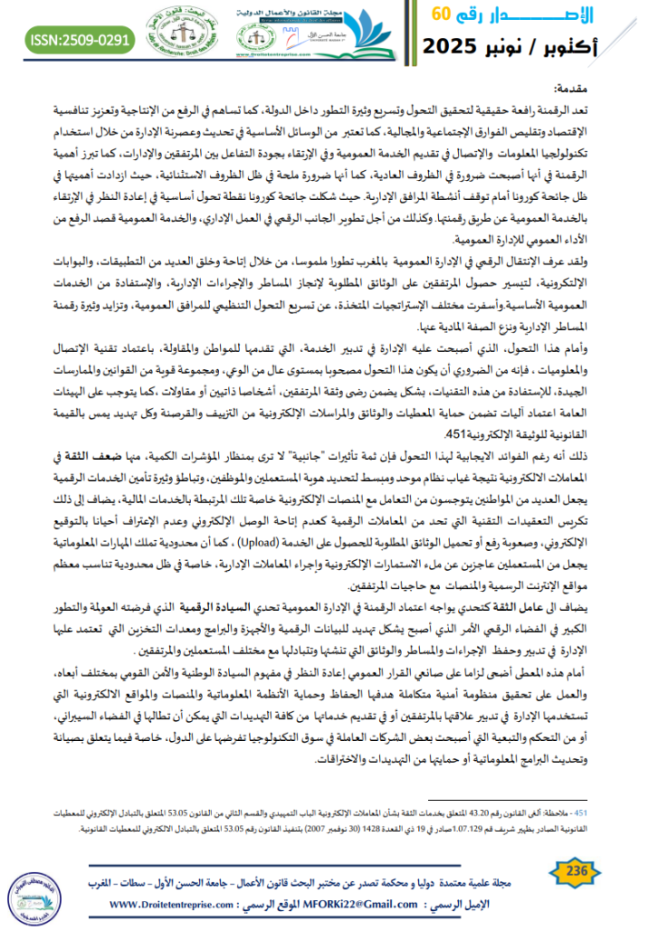 The digital transformation of Morocco’s public administration has made substantial progress, particularly through the development of electronic platforms and applications designed to facilitate access to essential public services and administrative documents. These initiatives have accelerated institutional restructuring and promoted the broader digitization and dematerialization of administrative procedures.