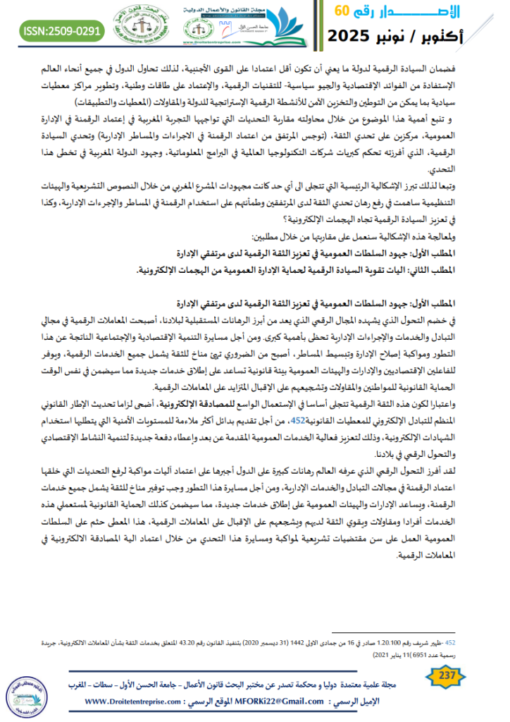 Nevertheless, such a transition necessitates the establishment of a robust legal framework, heightened institutional awareness, and the adoption of best practices to ensure both the reliability of administrative processes and the trust of users, whether individuals or businesses. In parallel, public authorities are required to implement effective mechanisms for the protection of data, documents, and electronic communications against risks such as falsification, piracy, or any threats that may undermine their legal validity.