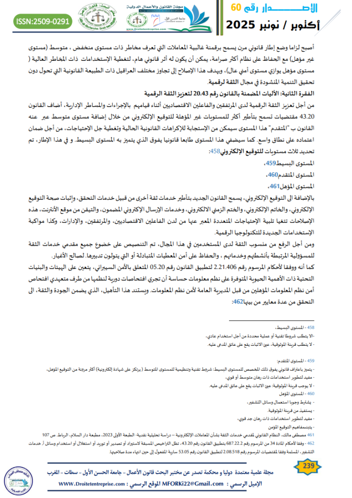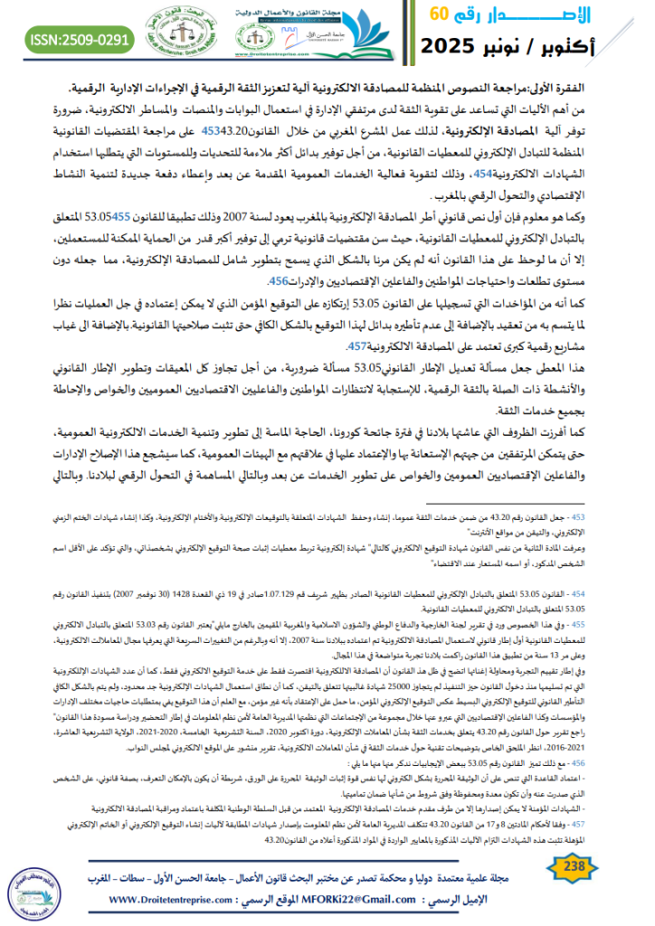 واعتبارا لكون هذه الثقة الرقمية تتجلى أساسا في الإستعمال الواسع للمصادقة الإلكترونية، أضحى لزاما تحديث الإطار القانوني المنظم للتبادل الإلكتروني للمعطيات القانونية[2]، من أجل تقديم بدائل أكثر ملاءمة للمستويات الأمنية التي يتطلبها استخدام الشهادات الإلكترونية، وذلك لتعزيز فعالية الخدمات العمومية المقدمة عن بعد وإعطاء دفعة جديدة لتنمية النشاط الإقتصادي والتحول الرقمي في بلادنا.