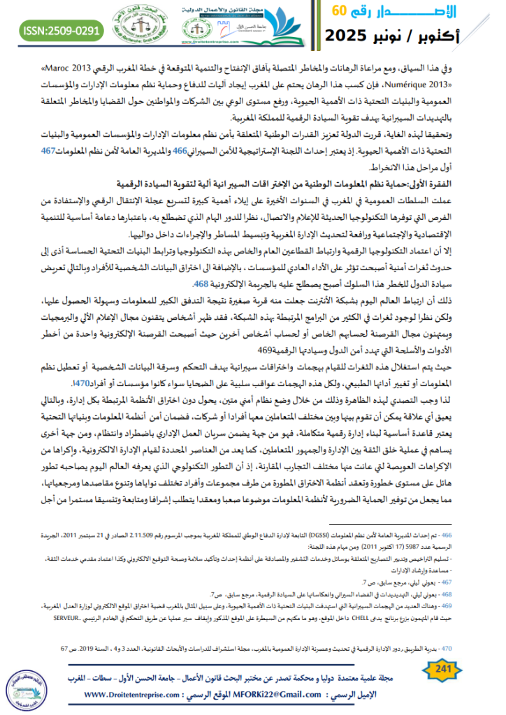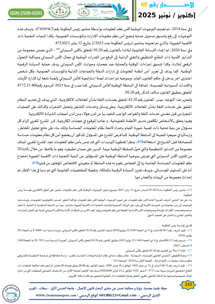 وفي سنة 2020، تم إغناء الترسانة القانونية لبلادنا بالقانون رقم 05.20 المتعلق بالأمن السيبراني[26] ، الذي تضمن مجموعة من التدابير الأمنية ذات الطابع التنظيمي والتقني الرامية إلى الرفع من القدرات الوطنية في مجال الأمن السيبراني ومواكبة التحول الرقمي لبلادنا، وكذا تنسيق إجراءات الوقاية والحماية ضد هجمات وحوادث الأمن السيبراني بهدف حماية السيادة الرقمية الوطنية، كما يهدف إلى تعزيز أمن أنظمة المعلومات في إدارات الدولة والجماعات الترابية والمؤسسات العمومية، وكل شخص اعتباري اخر يدخل في حكم القانون العام، وبموجبه تم إحداث لجنة استراتجية للأمن السيبراني ولجنة تابعة لها لإدارة الأزمات والأحداث السيبرانية الجسيمة، إضافة الى السلطة الوطنية للأمن السيبراني. كما صدر في سنة 2021 المرسوم رقم2.21.406[27] المتعلق بتطبيق القانون سالف الذكر رقم 05.20.