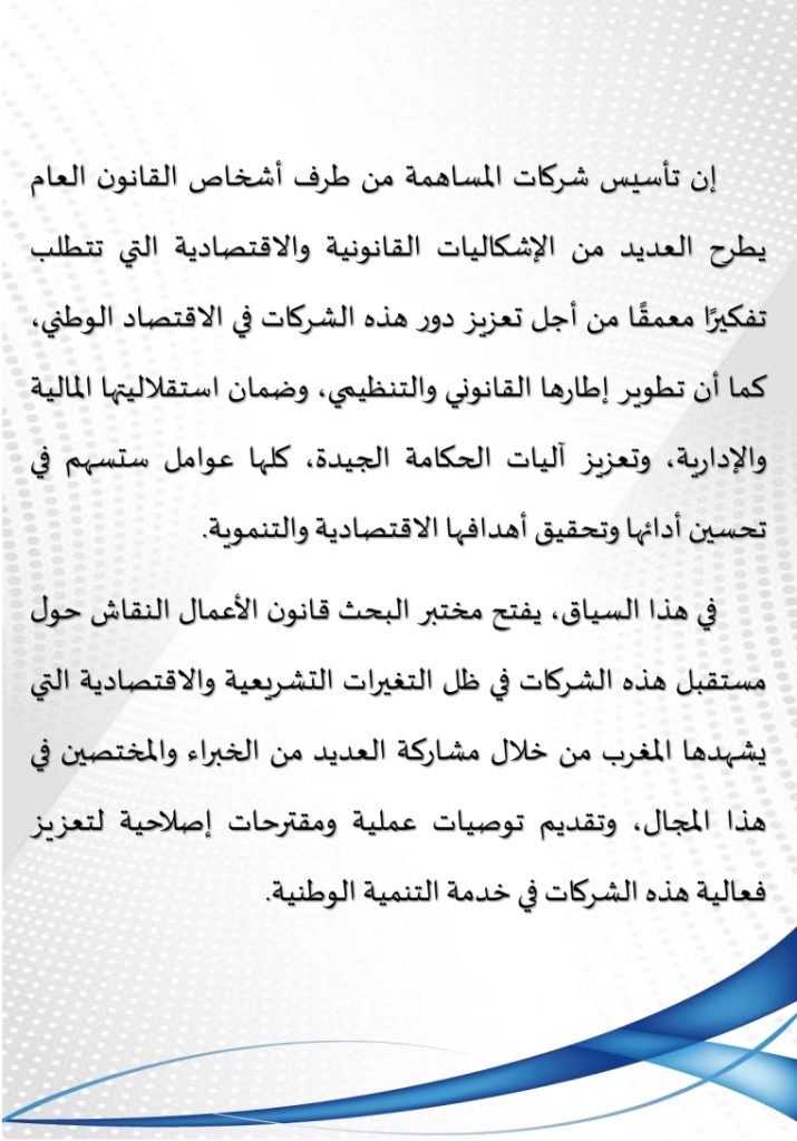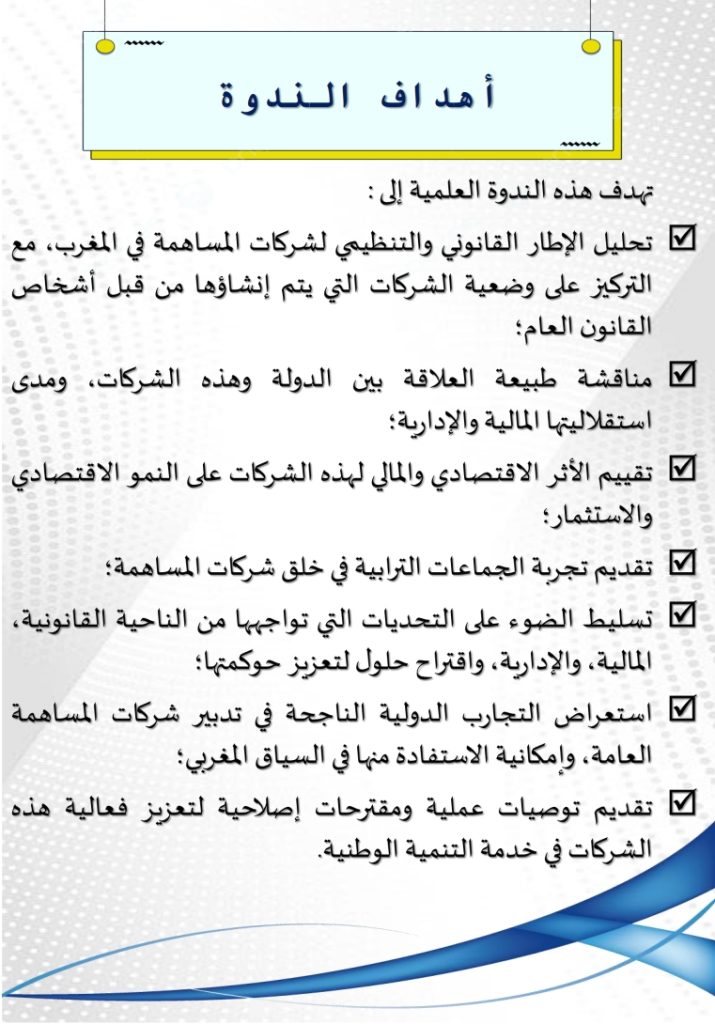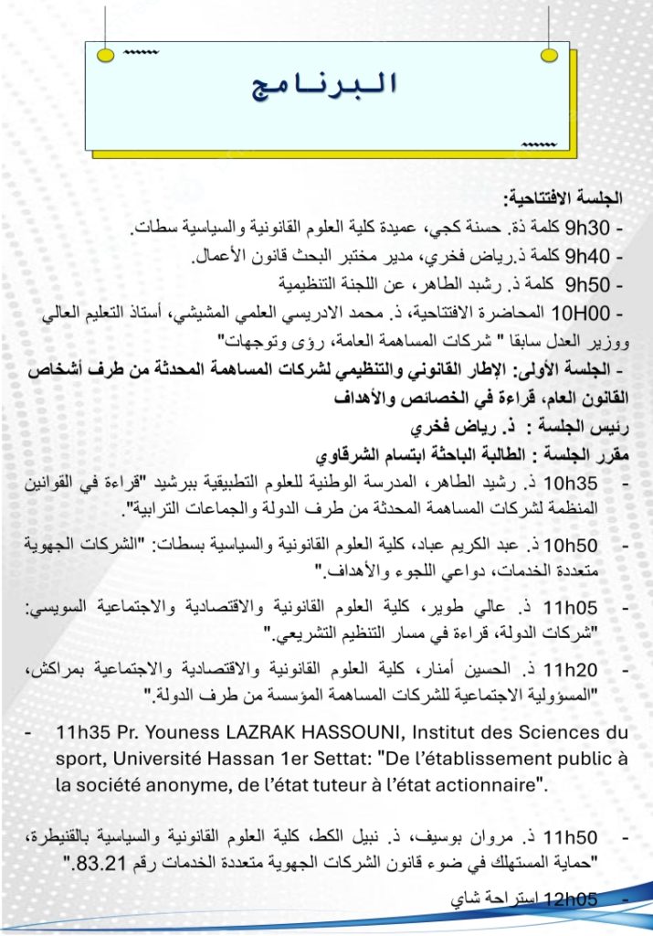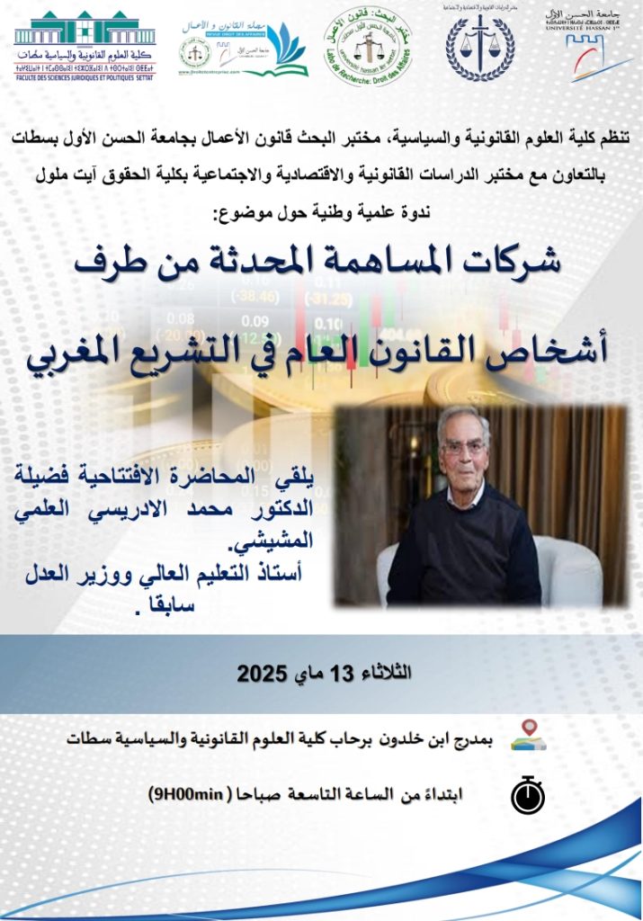 شركات المساهمة المحدثة من طرف اشخاص القانون العام في التشريع المغربي _ موضوع ندوة علمية من تنظيم كلية العلوم القانونية و السياسية مختبر البحث قانون الأعمال بسطات