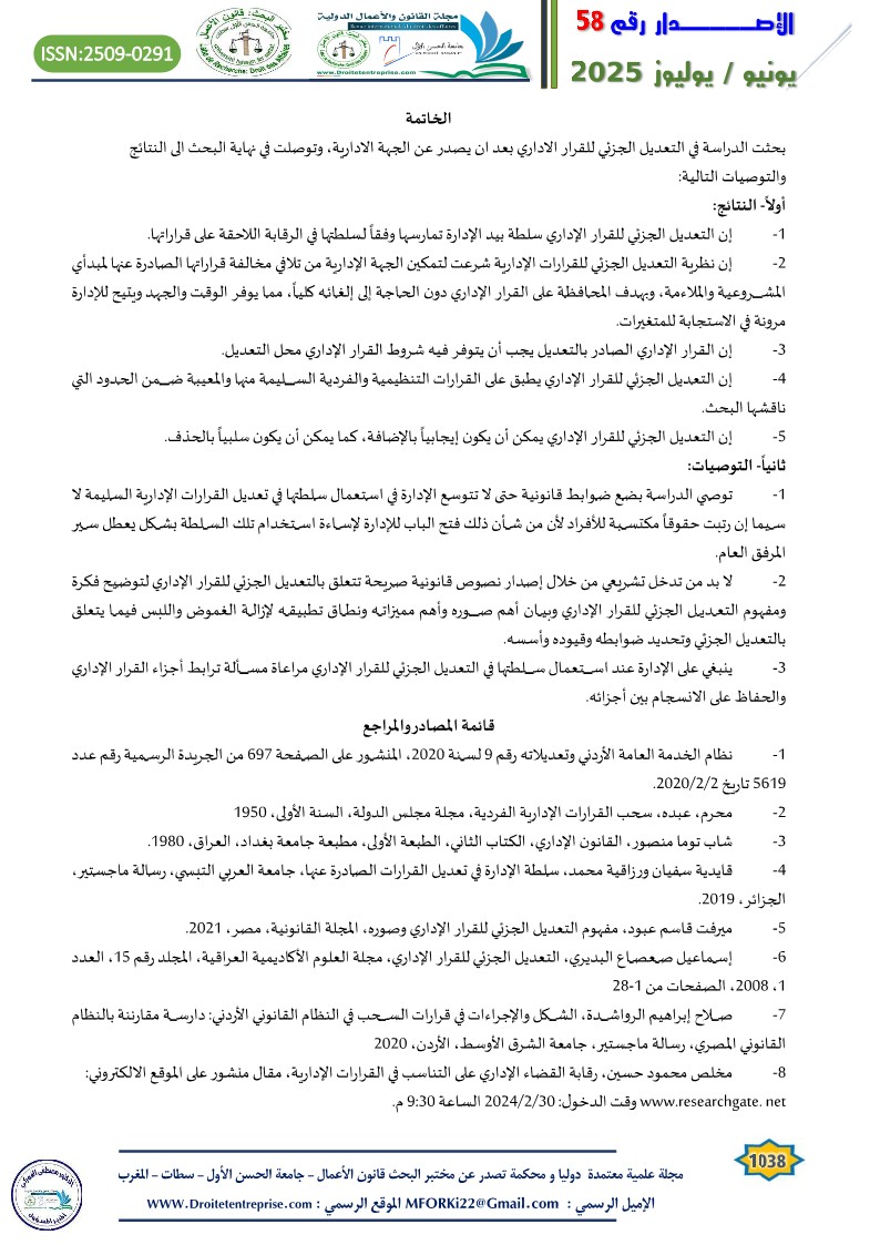 بحثت الدراسة في التعديل الجزئي للقرار الاداري بعد ان يصدر عن الجهة الادارية، وتوصلت في نهاية البحث الى النتائج والتوصيات التالية: