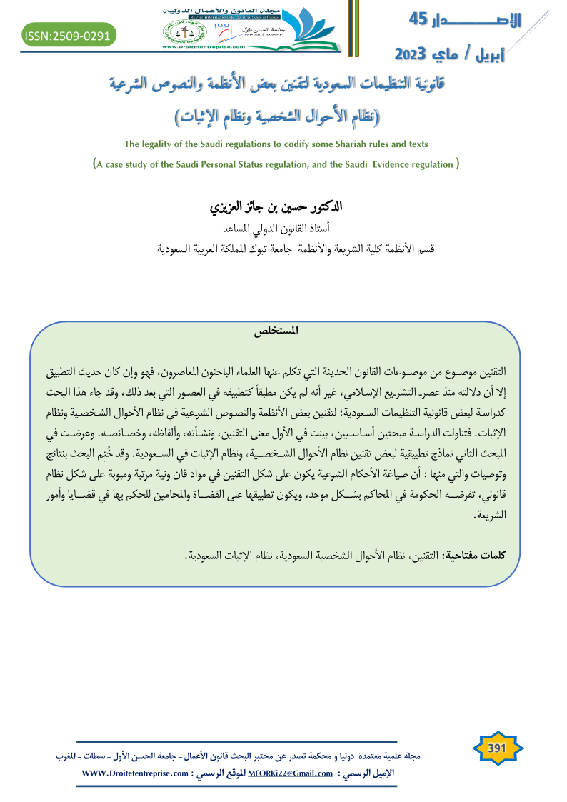 كلمات مفتاحية: التقنين، نظام الأحوال الشخصية السعودية، نظام الإثبات السعودية.