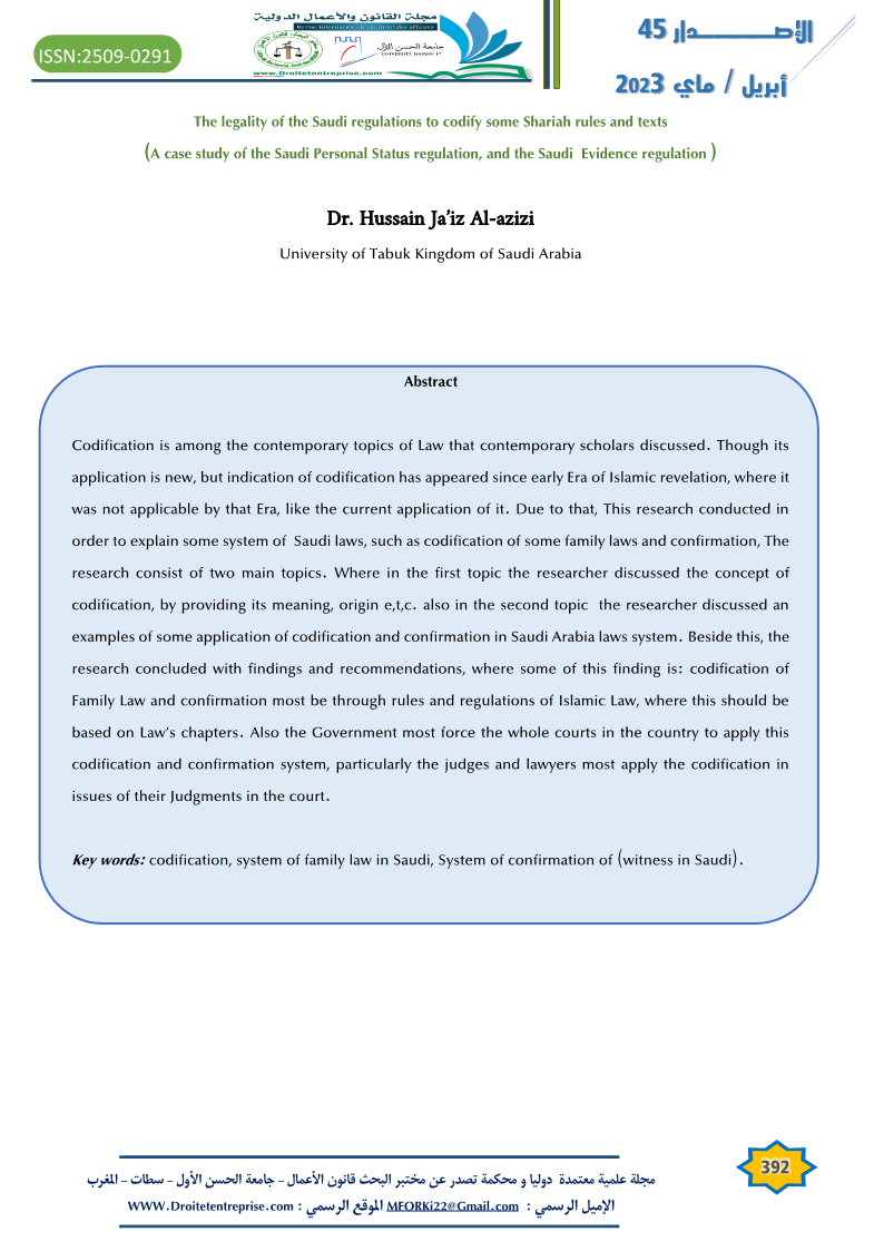 Key words: codification, system of family law in Saudi, System of confirmation of (witness in Saudi).