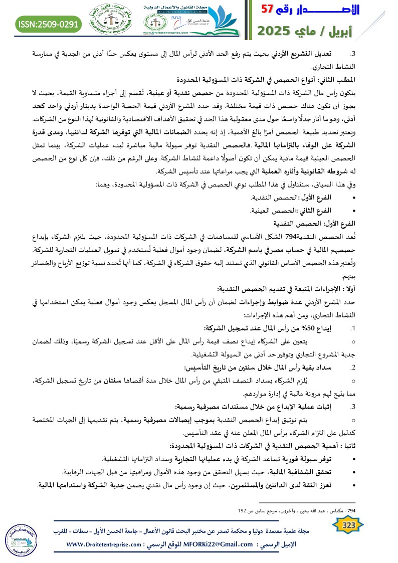 The research also examines the role of capital in LLCs, noting that the minimum capital requirement in Jordan is only one Jordanian dinar, which has sparked debate over its adequacy as a financial guarantee for creditors. Additionally, it discusses the types of shares (monetary and in-kind), their submission conditions, and the importance of legal oversight.