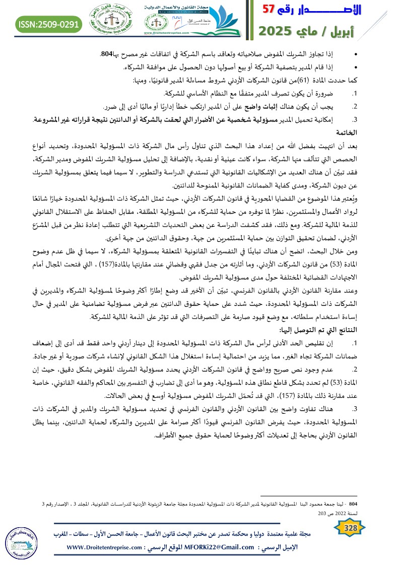 3. هناك تفاوت واضح بين القانون الأردني والقانون الفرنسي في تحديد مسؤولية الشريك والمدير في الشركات ذات المسؤولية المحدودة، حيث يفرض القانون الفرنسي قيودًا أكثر صرامة على المديرين والشركاء لحماية الدائنين، بينما يظل القانون الأردني بحاجة إلى تعديلات أكثر وضوحًا لحماية حقوق جميع الأطراف.