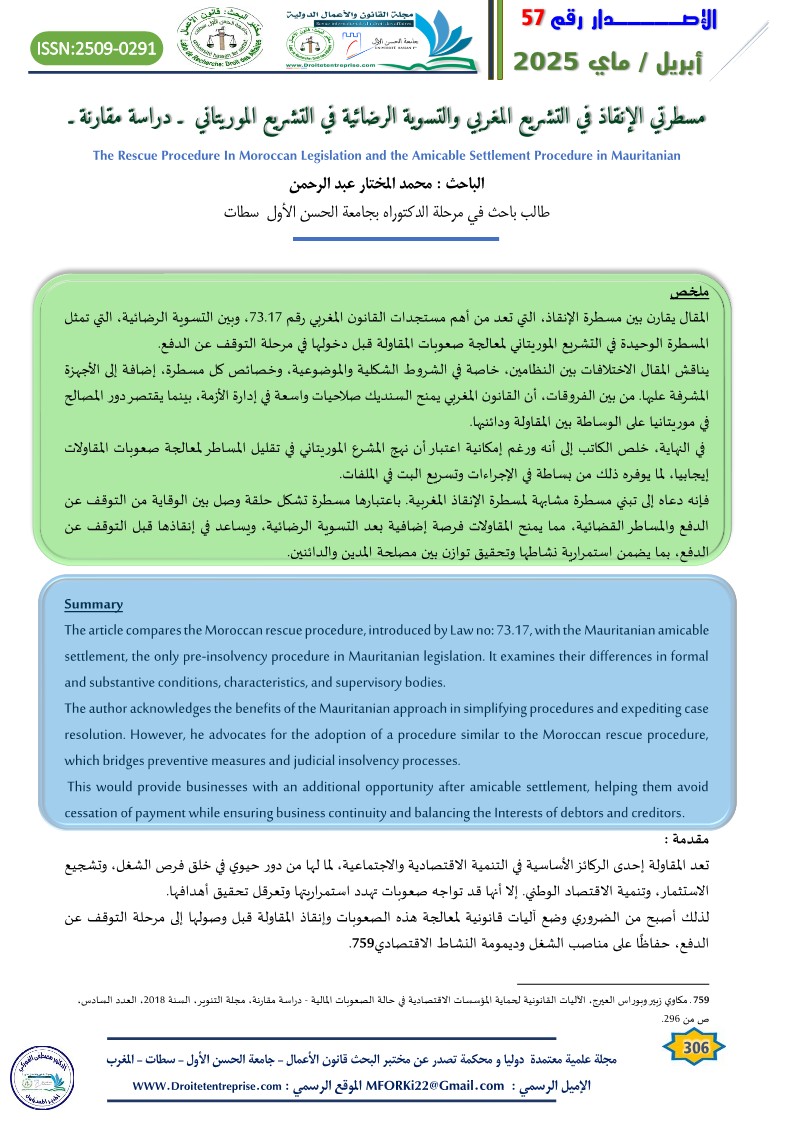 المقال يقارن بين مسطرة الإنقاذ، التي تعد من أهم مستجدات القانون المغربي رقم 73.17، وبين التسوية الرضائية، التي تمثل المسطرة الوحيدة في التشريع الموريتاني لمعالجة صعوبات المقاولة قبل دخولها في مرحلة التوقف عن الدفع.
