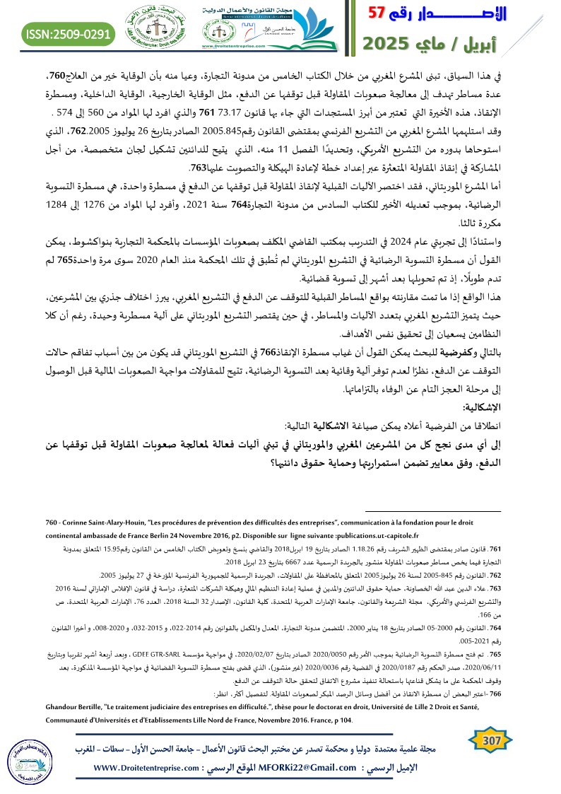 إلى أي مدى نجح كل من المشرعين المغربي والموريتاني في تبني آليات فعالة لمعالجة صعوبات المقاولة قبل توقفها عن الدفع، وفق معايير تضمن استمراريتها وحماية حقوق دائنيها؟