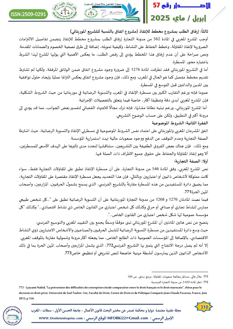 أما في التشريع الموريتاني فقد تطرقت المادة 1276 إلى ضرورة وجود مشروع اتفاق ضمن الوثائق المرفقة، ولكنها لم تشترط تقديم مخطط مفصل كما هو الحال في المغرب. ومع ذلك، فإن وجود مشروع اتفاق يعكس التزامًا عمليًا بإيجاد حلول توافقية بين المدين والدائنين قبل التوسع في المسطرة.