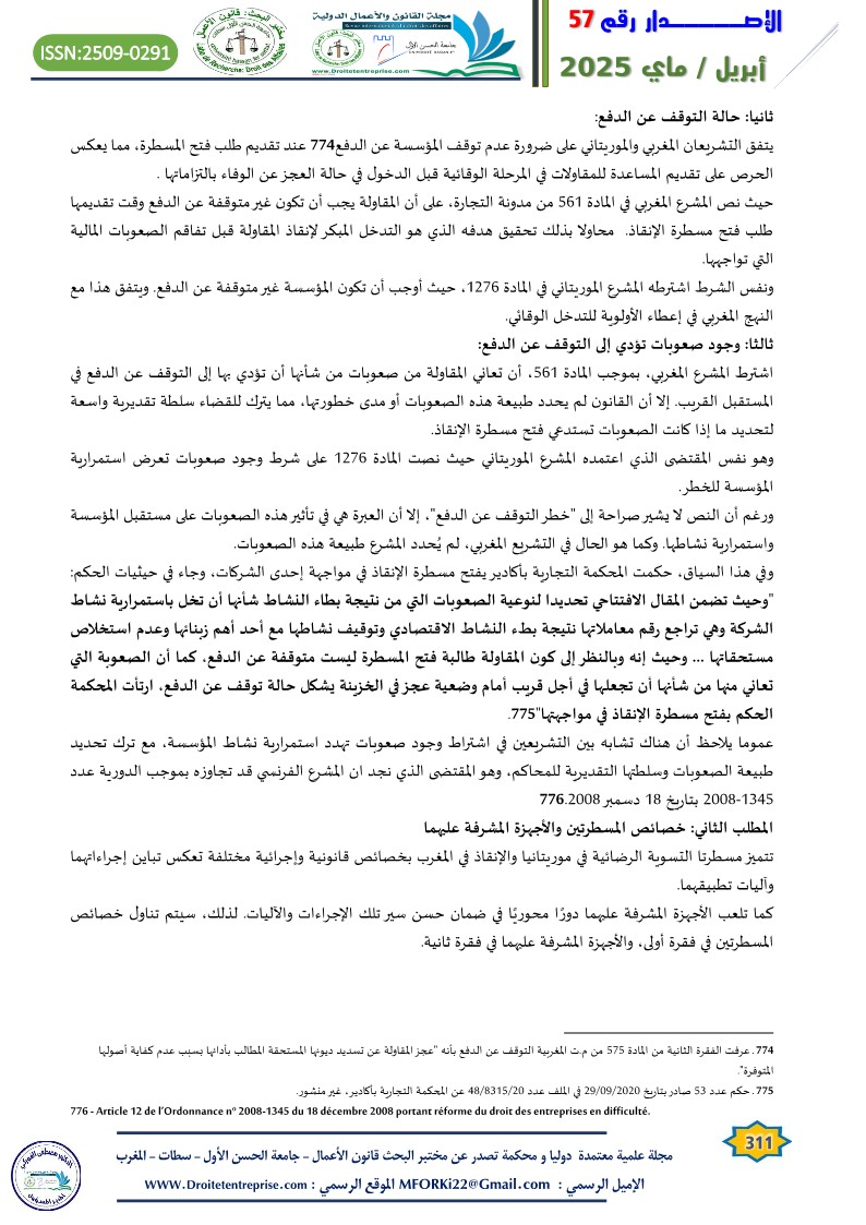 يتفق التشريعان المغربي والموريتاني على ضرورة عدم توقف المؤسسة عن الدفع[16] عند تقديم طلب فتح المسطرة، مما يعكس الحرص على تقديم المساعدة للمقاولات في المرحلة الوقائية قبل الدخول في حالة العجز عن الوفاء بالتزاماتها .