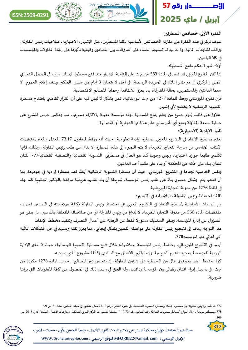يناقش المقال الاختلافات بين النظامين، خاصة في الشروط الشكلية والموضوعية، وخصائص كل مسطرة، إضافة إلى الأجهزة المشرفة عليها. من بين الفروقات، أن القانون المغربي يمنح السنديك صلاحيات واسعة في إدارة الأزمة، بينما يقتصر دور المصالح في موريتانيا على الوساطة بين المقاولة ودائنيها.