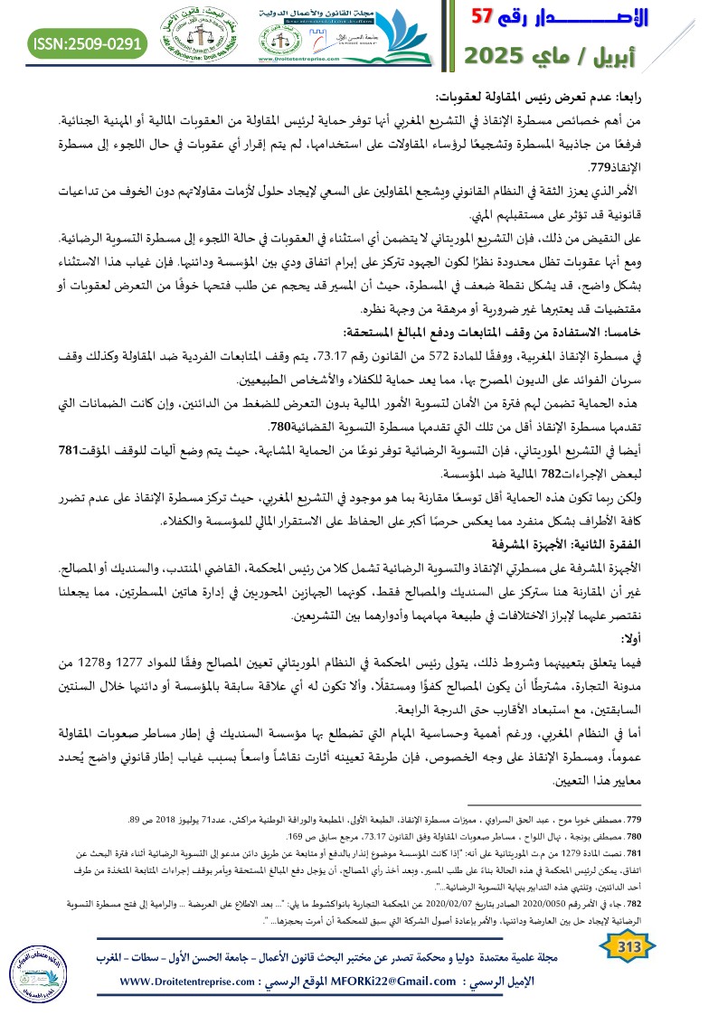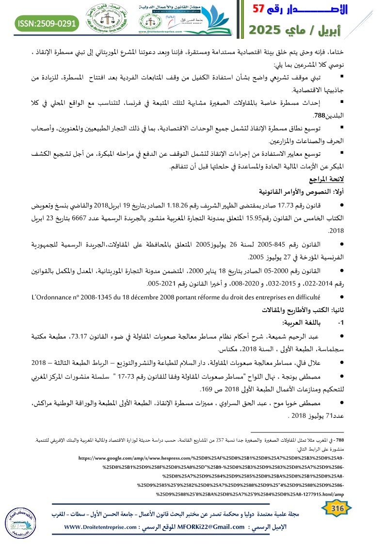 [4] ـ القانون رقم 845-2005 لسنة 26 يوليوز2005 المتعلق بالمحافظة على المقاولات، الجريدة الرسمية للجمهورية الفرنسية المؤرخة في 27 يوليوز 2005.