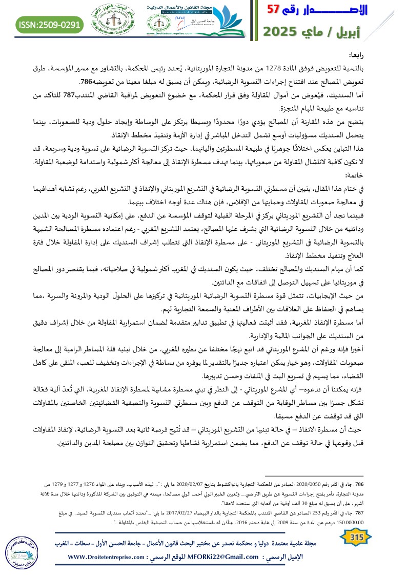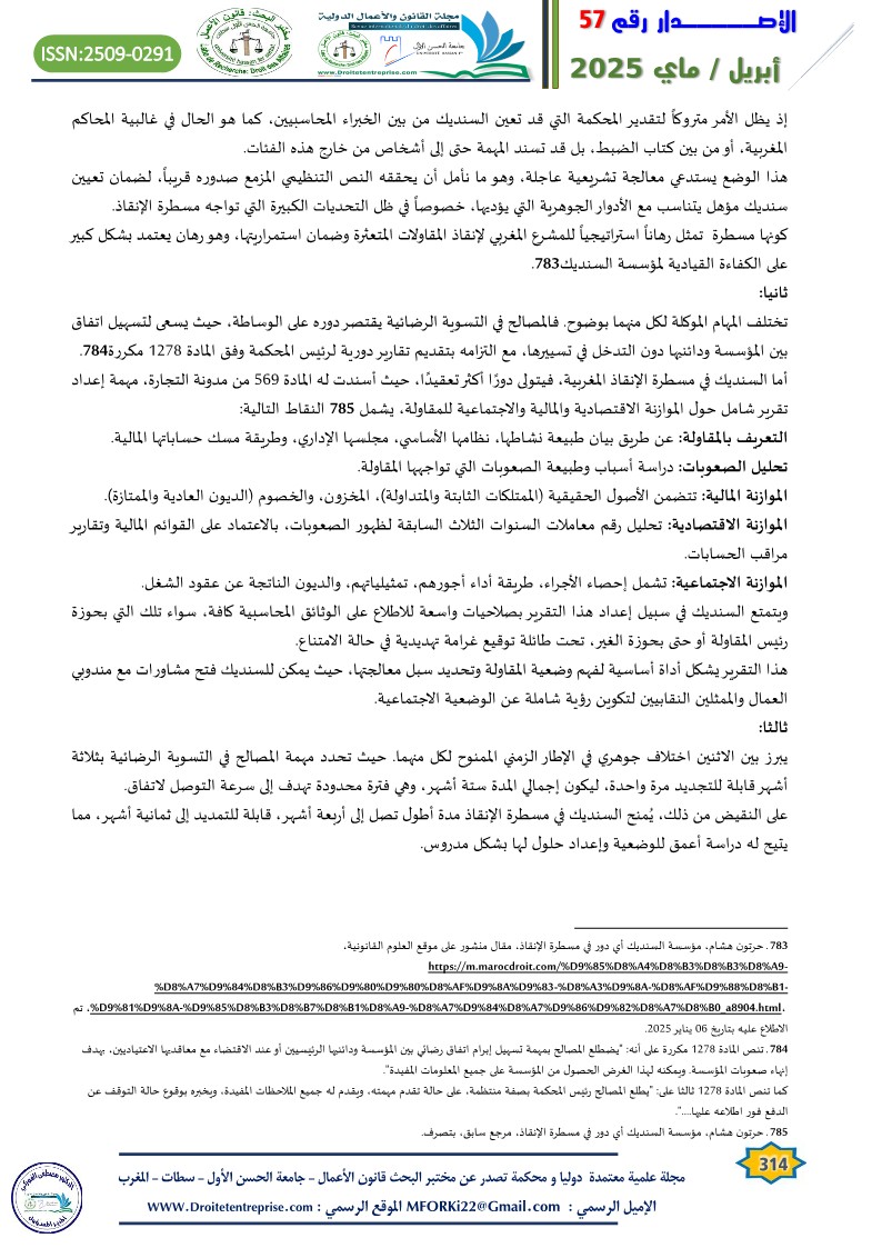 [25] ـ حرتون هشام، مؤسسة السنديك أي دور في مسطرة الإنقاذ، مقال منشور على موقع العلوم القانونية، https://m.marocdroit.com/%D9%85%D8%A4%D8%B3%D8%B3%D8%A9-%D8%A7%D9%84%D8%B3%D9%86%D9%80%D9%80%D8%AF%D9%8A%D9%83-%D8%A3%D9%8A-%D8%AF%D9%88%D8%B1-%D9%81%D9%8A-%D9%85%D8%B3%D8%B7%D8%B1%D8%A9-%D8%A7%D9%84%D8%A7%D9%86%D9%82%D8%A7%D8%B0_a8904.html، ، تم الاطلاع عليه بتاريخ 06 يناير 2025.