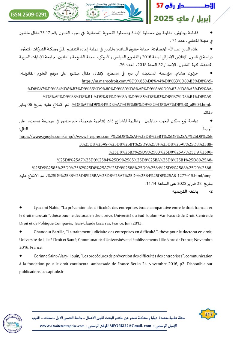 [5] ـ علاء الدين عبد الله الخصاونة، حماية حقوق الدائنين والمدين في عملية إعادة التنظيم المالي وهيكلة الشركات المتعثرة، دراسة في قانون الإفلاس الإماراتي لسنة 2016 والتشريع الفرنسي والأمريكي، مجلة الشريعة والقانون، جامعة الإمارات العربية المتحدة، كلية القانون، الإصدار 32 السنة 2018، العدد 76، الإمارات العربية المتحدة، ص من 166.