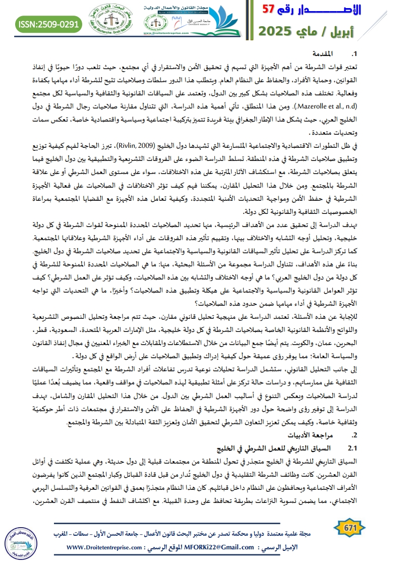تعتبر قوات الشرطة من أهم الأجهزة التي تسهم في تحقيق الأمن والاستقرار في أي مجتمع، حيث تلعب دورًا حيويًا في إنفاذ القوانين، وحماية الأفراد، والحفاظ على النظام العام. ويتطلب هذا الدور سلطات وصلاحيات تتيح للشرطة أداء مهامها بكفاءة وفعالية. تختلف هذه الصلاحيات بشكل كبير بين الدول، وتعتمد على السياقات القانونية والثقافية والسياسية لكل مجتمع (Mazerolle et al., n.d.). ومن هذا المنطلق، تأتي أهمية هذه الدراسة، التي تتناول مقارنة صلاحيات رجال الشرطة في دول الخليج العربي، حيث يشكل هذا الإطار الجغرافي بيئة فريدة تتميز بتركيبة اجتماعية وسياسية واقتصادية خاصة، تعكس سمات وتحديات متعددة.