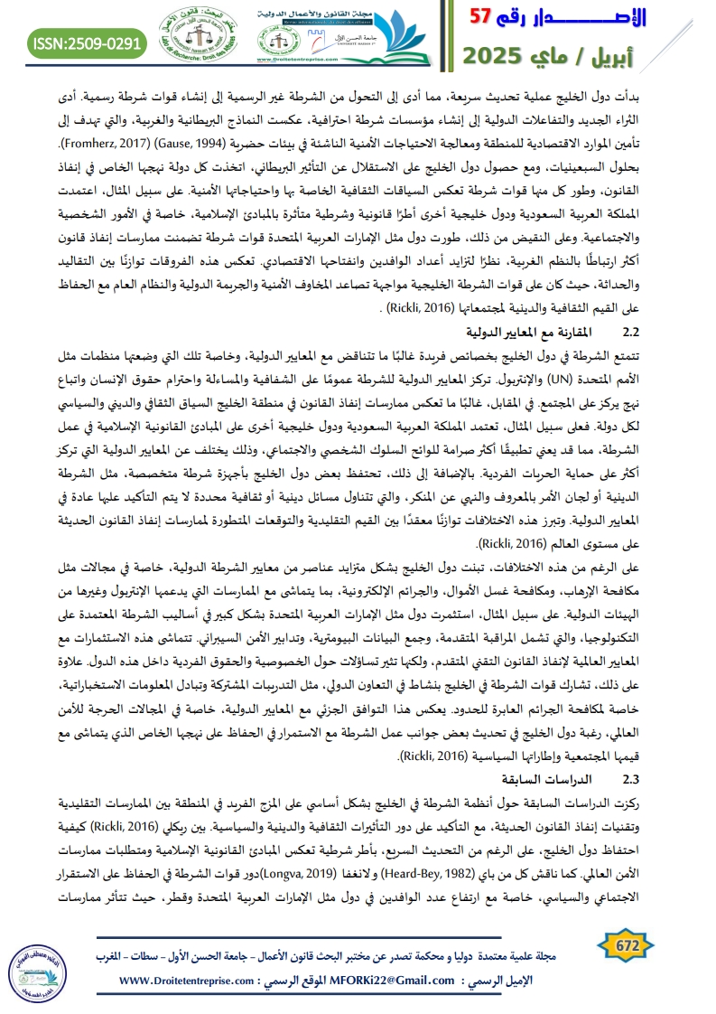 ركزت الدراسات السابقة حول أنظمة الشرطة في الخليج بشكل أساسي على المزج الفريد في المنطقة بين الممارسات التقليدية وتقنيات إنفاذ القانون الحديثة، مع التأكيد على دور التأثيرات الثقافية والدينية والسياسية. بين ريكلي (Rickli, 2016) كيفية احتفاظ دول الخليج، على الرغم من التحديث السريع، بأطر شرطية تعكس المبادئ القانونية الإسلامية ومتطلبات ممارسات الأمن العالمي. كما ناقش كل من باي (Heard-Bey, 1982) و لانغفا (Longva, 2019)دور قوات الشرطة في الحفاظ على الاستقرار الاجتماعي والسياسي، خاصة مع ارتفاع عدد الوافدين في دول مثل الإمارات العربية المتحدة وقطر، حيث تتأثر ممارسات الشرطة بالنماذج الغربية لتلبية احتياجات السكان المتنوعين. بالإضافة إلى ذلك، يناقش كوردسمان (Cordesman et al., 2017) تزايد اندماج دول الخليج مع المعايير الأمنية الدولية، بما في ذلك إجراءات مكافحة الإرهاب والجريمة الإلكترونية، مع تكييف هذه الممارسات لتلائم الهياكل الاجتماعية المحلية. وبشكل عام، تكشف هذه الدراسات عن مشهد معقد لأنظمة الشرطة في الخليج، حيث تسعى السلطات للحفاظ على القيم التقليدية مع مواجهة التحديات الأمنية الحديثة.