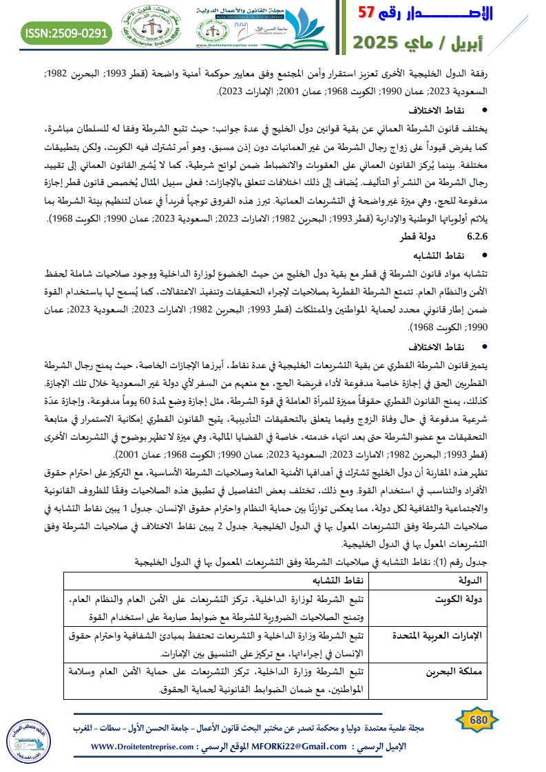 This paper presents a comprehensive comparison of police powers in the Gulf Cooperation Council (GCC) countries, highlighting how police powers vary among these nations based on legislative, political, and social contexts. The study focuses on analyzing the legal framework of each Gulf state, including the United Arab Emirates, Saudi Arabia, Kuwait, Bahrain, Qatar, and Oman. It aims to explore how cultural and religious variables influence police powers and their impact on the effectiveness of policing and its interaction with the community. The results indicate significant similarities among GCC countries concerning the commitment to maintaining public security and addressing crimes. However, differences arise in the details of power implementation, such as the use of force, handling of public gatherings, and investigation procedures, which are influenced by societal values and local regulations. Additionally, the study discusses legal challenges facing police institutions in the Gulf, such as cybercrime and counterterrorism, and provides recommendations to enhance police efficiency in line with international standards, fostering regional security cooperation while preserving each country’s cultural particularities.