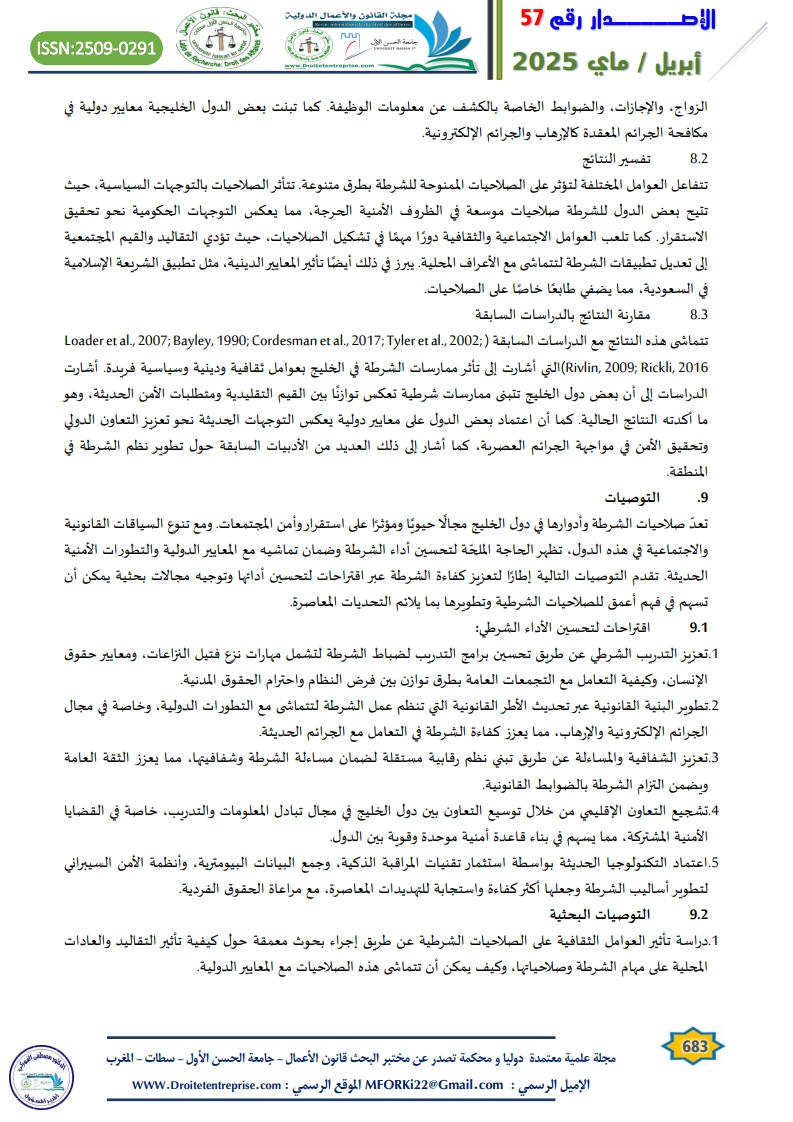 - دراسة تأثير العوامل الثقافية على الصلاحيات الشرطية عن طريق إجراء بحوث معمقة حول كيفية تأثير التقاليد والعادات المحلية على مهام الشرطة وصلاحياتها، وكيف يمكن أن تتماشى هذه الصلاحيات مع المعايير الدولية.