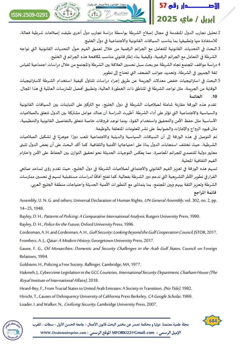 - تحليل تجارب الدول المتقدمة في مجال إصلاح الشرطة بواسطة دراسة تجارب دول أخرى طبقت إصلاحات شرطية فعالة، للاستفادة منها وتطبيقها بما يناسب السياقات القانونية والاجتماعية في دول الخليج.